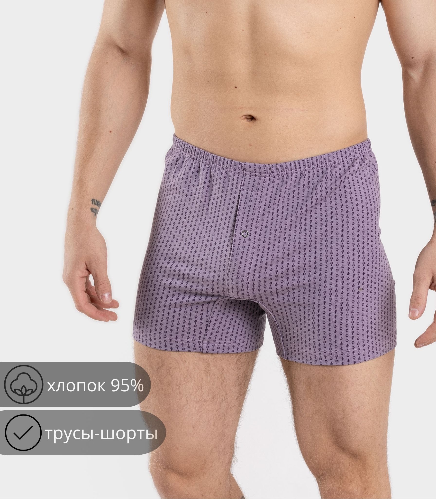 Мужские трусы-шорты выполнены из качественного хлопка. Модель на удобном эластичном поясе, который не сдавливает кожу и не ощущается на теле. Благодаря свободному крою трусы не сковывают движений и комфортны в течение дня.;