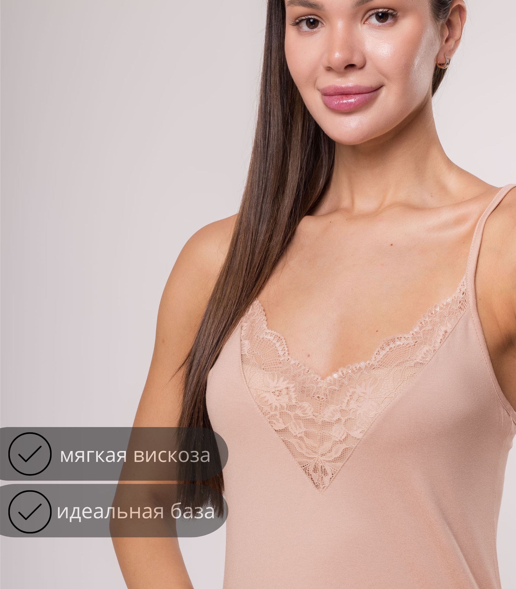 Изящный топ на бретелях, украшенный тонким ажурным кружевом, идеально дополнит как деловой, так и повседневный образ.