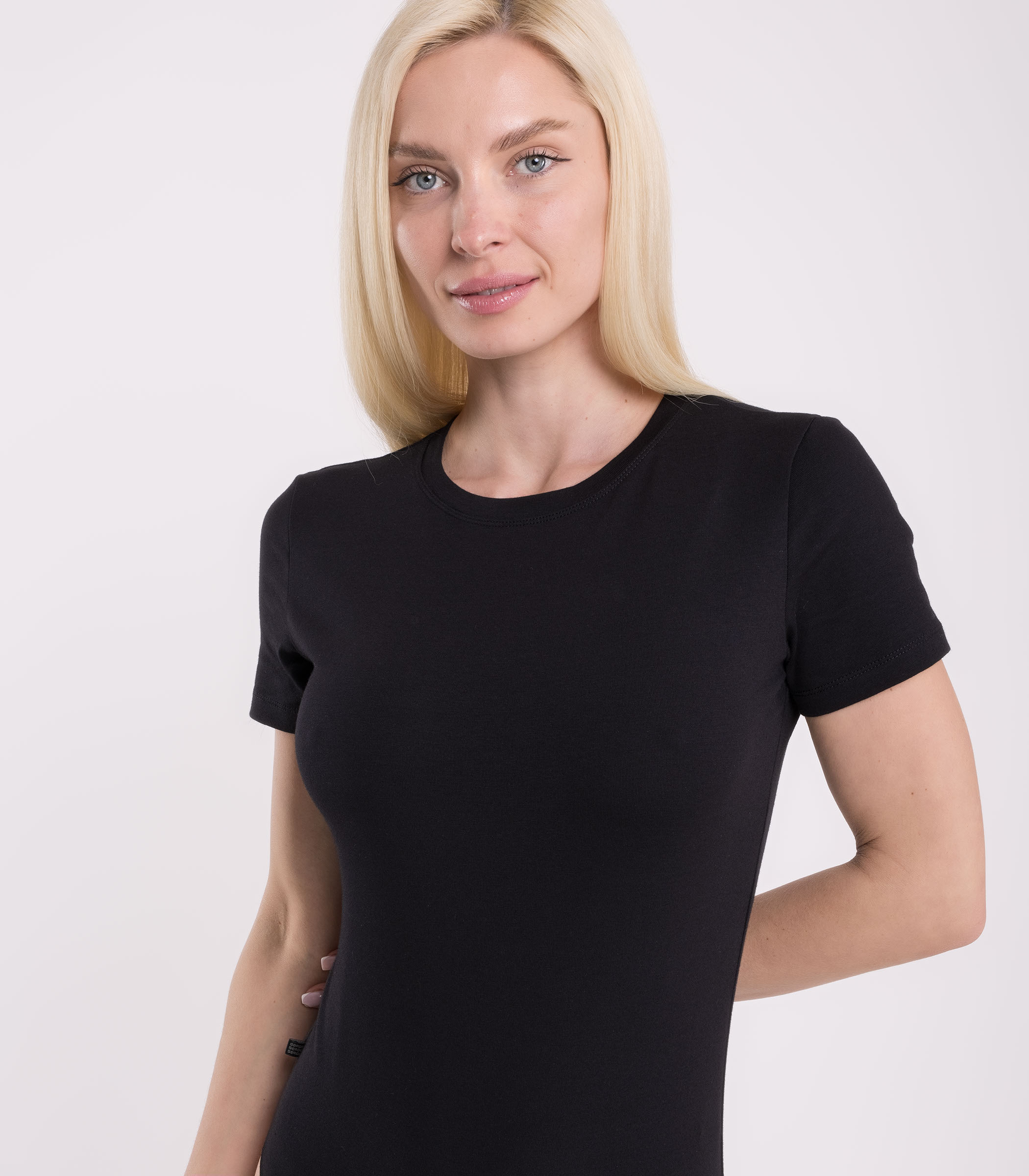 Женское боди с коротким рукавом и круглым вырезом горловины выполнено из высококачественного хлопка с добавлением эластана. Боди приталенного силуэто комфортно облегает тело. Модель с застежкой на кнопках;