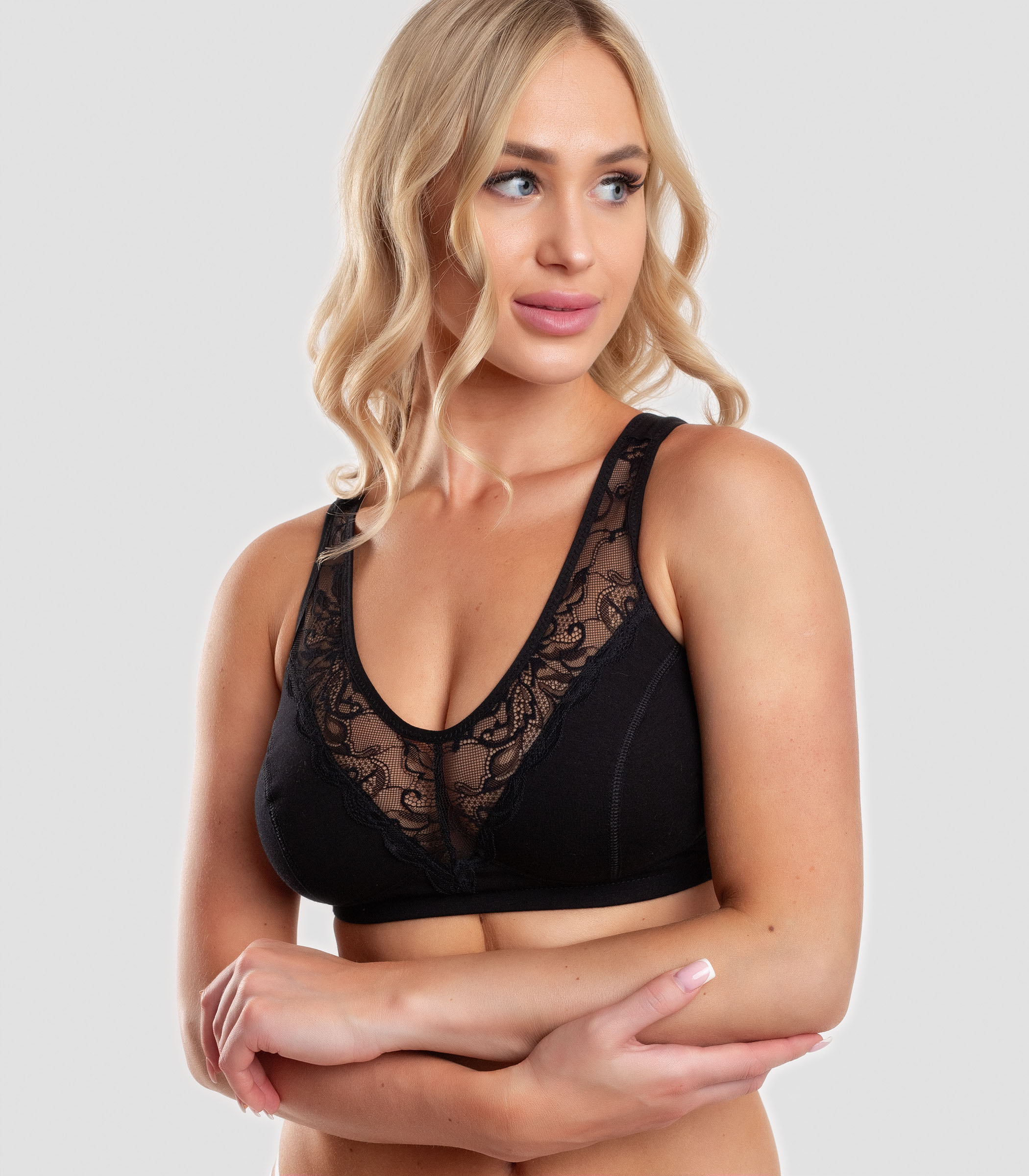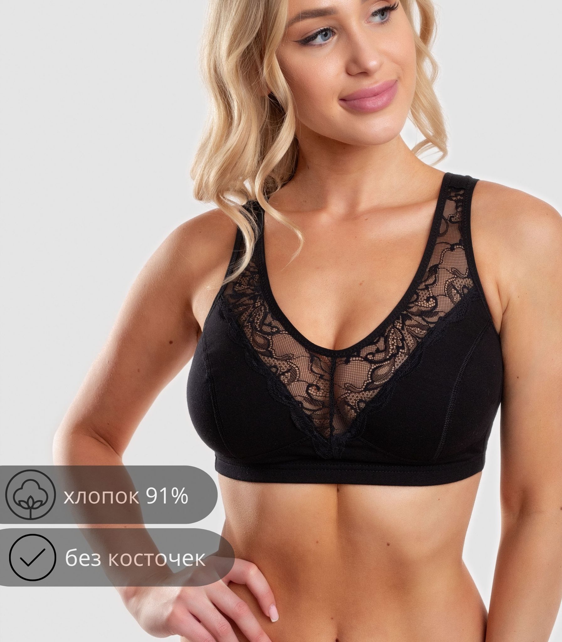 Комфортное бюстье на широких бретелях выполнено из высококачественного хлопкового полотна. Модель без застежки, с эластичной резинкой. Передняя деталь отделана ажурным кружевом. Бюстье комфортно прилегает к телу и хорошо поддерживает грудь.