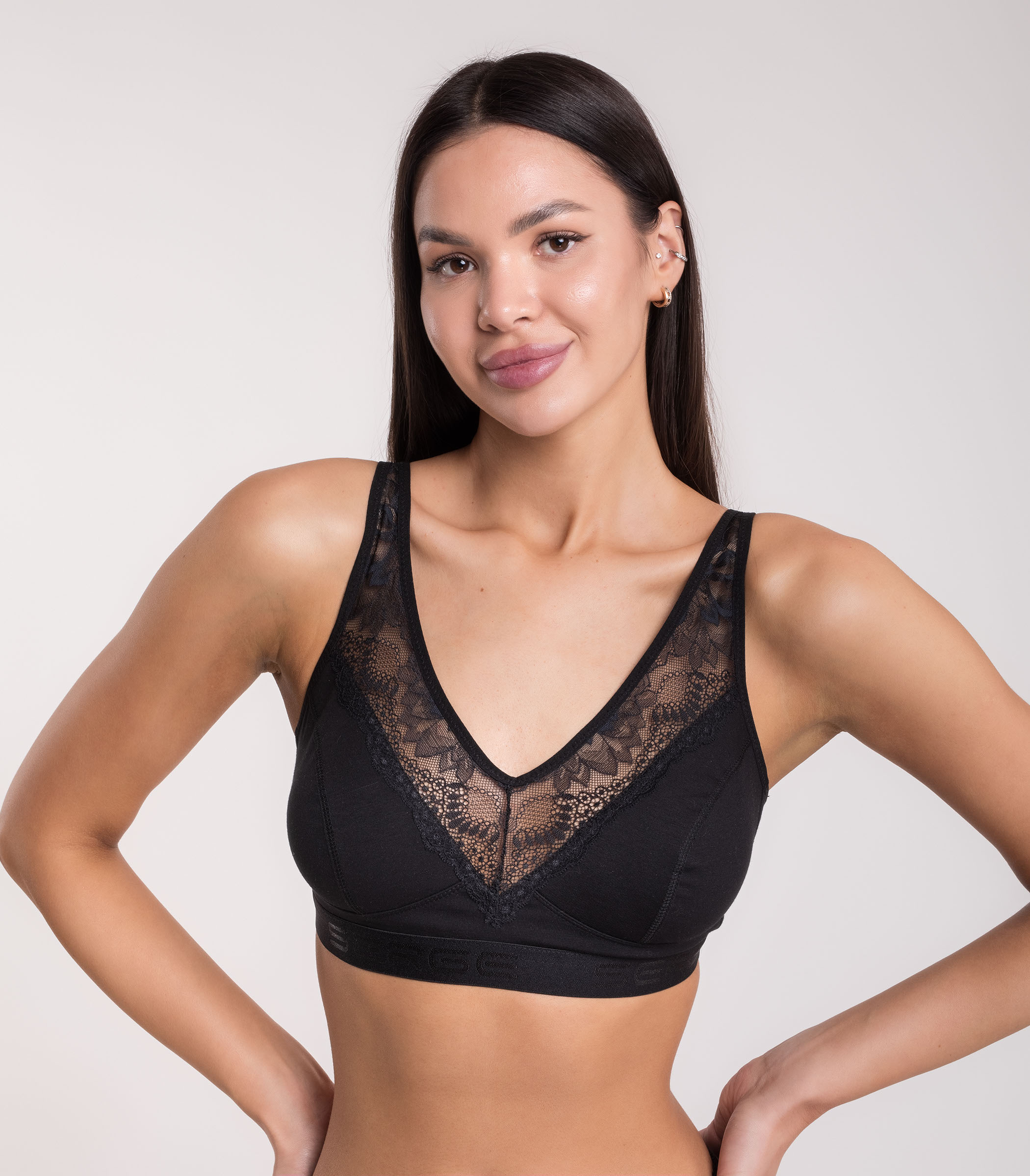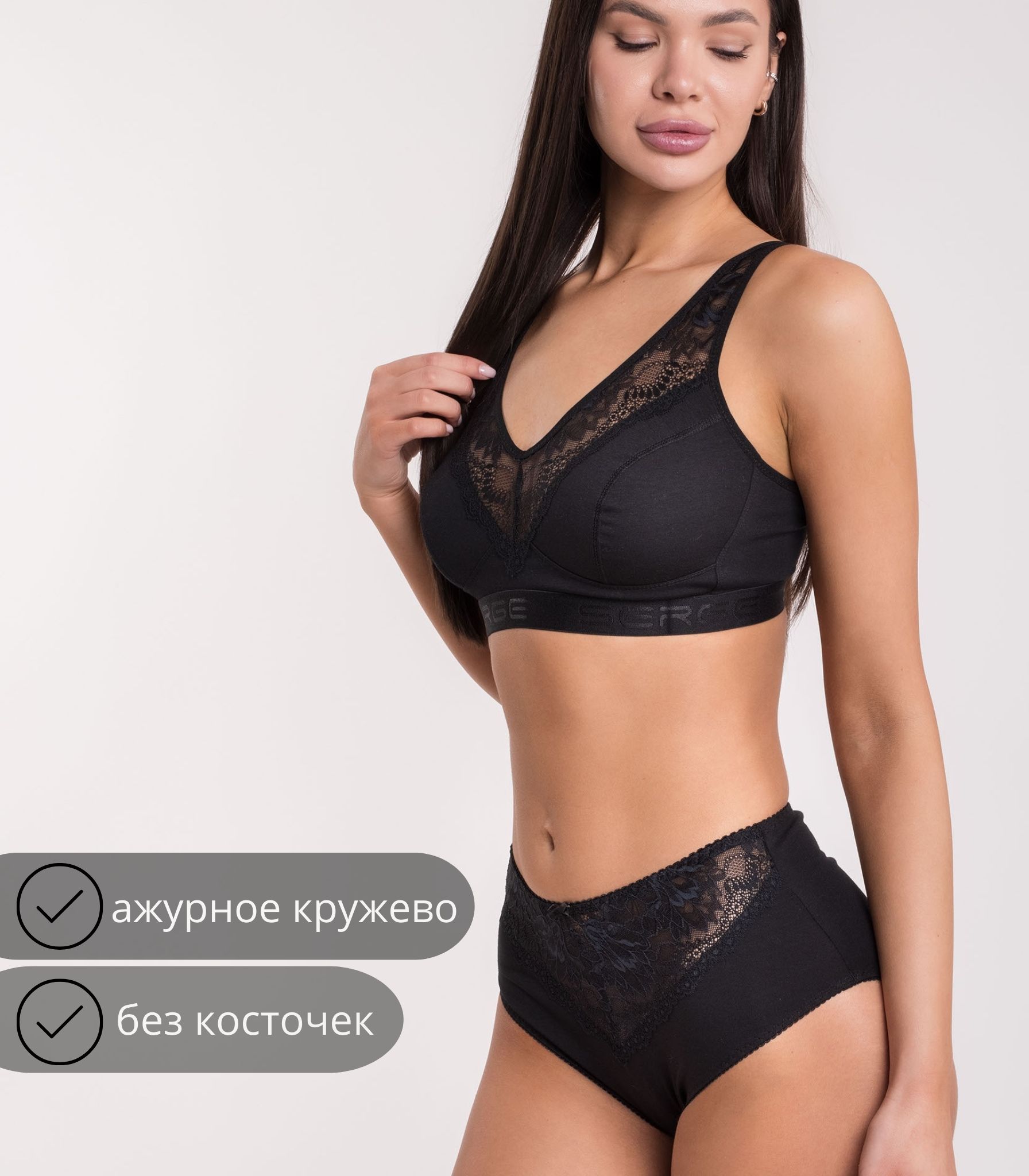 Базовое бюстье из мягкого хлопкового полотна, декорированное нежным кружевом. Модель на регулируемых бретелях с застежкой обеспечивает максимальный комфорт и поддержку груди. Бюстье без чашек подходит для занятий спортом, повседневной носки, отдыха и фитнеса.