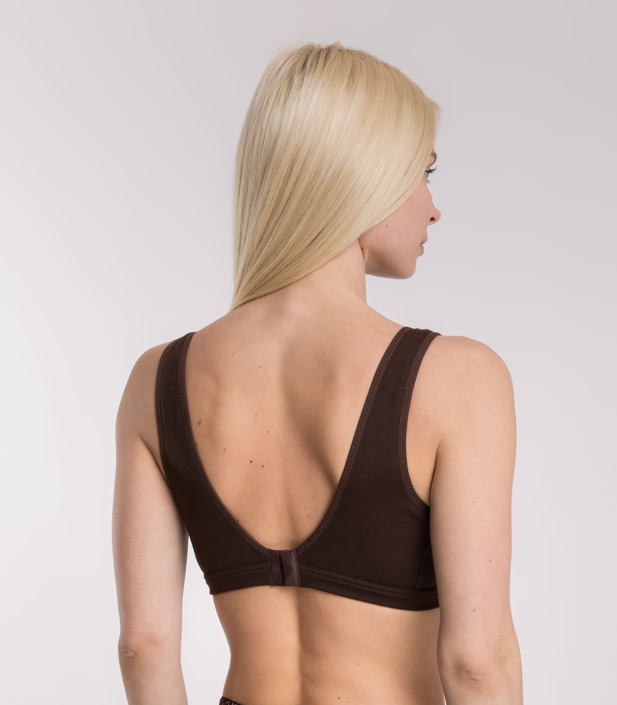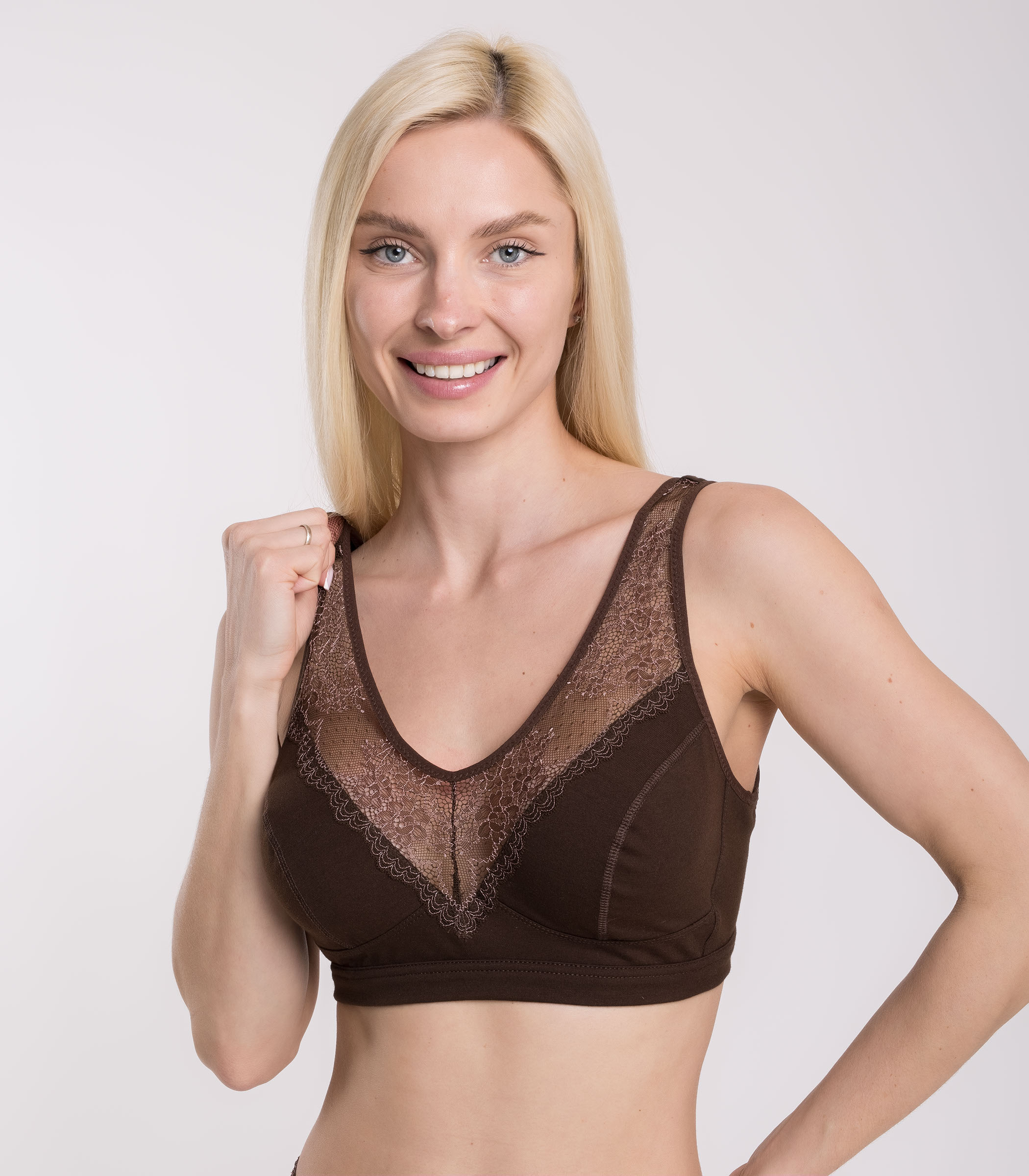 Базовое бюстье из мягкого хлопкового полотна, декорированное нежным кружевом. Модель на широких бретелях с застежкой обеспечивает максимальный комфорт и поддержку груди. Бюстье без чашек подходит для занятий спортом, повседневной носки, отдыха и фитнеса.