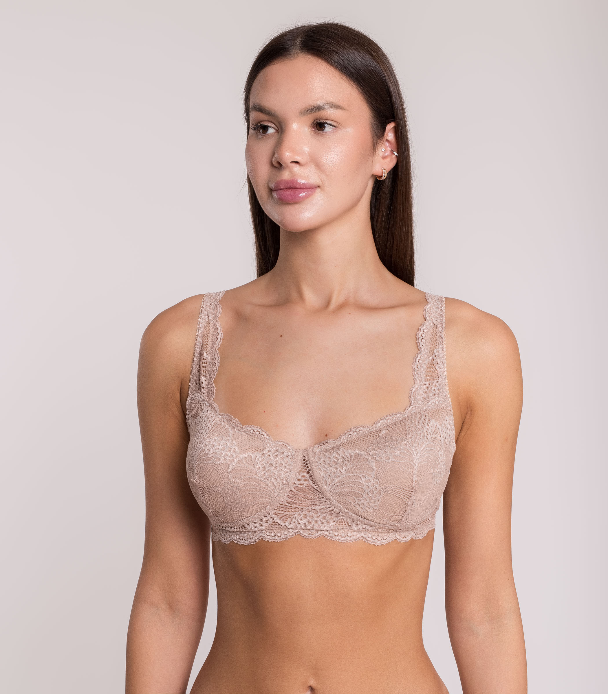 Бюстье с чашками выполнено из эластичного кружева. Бюстье без косточек на застежке с тонкими бретелями на регуляции. Спереди бретели декорированы кружевом. Модель отлично сидит по фигуре и бережно поддерживает грудь.