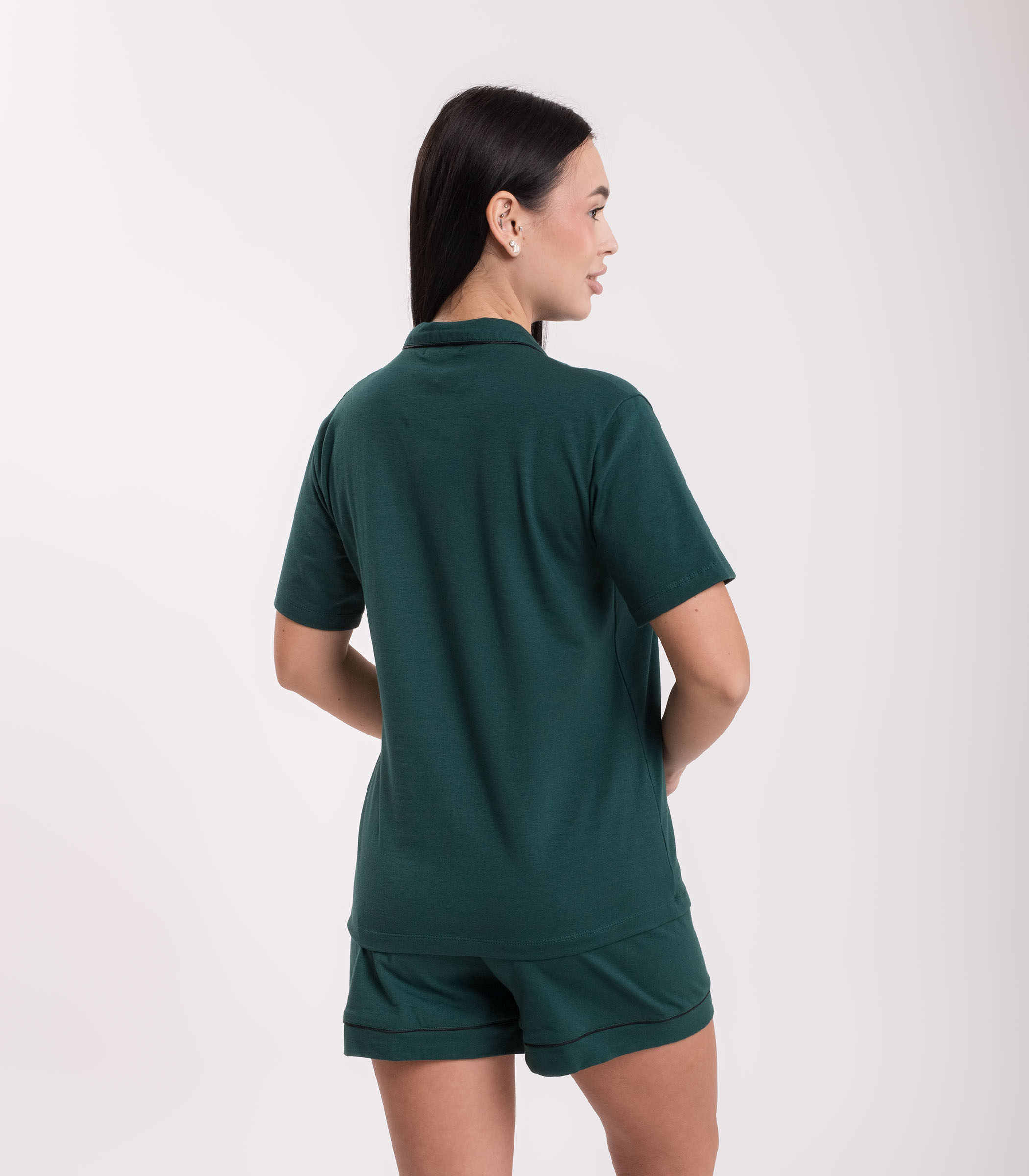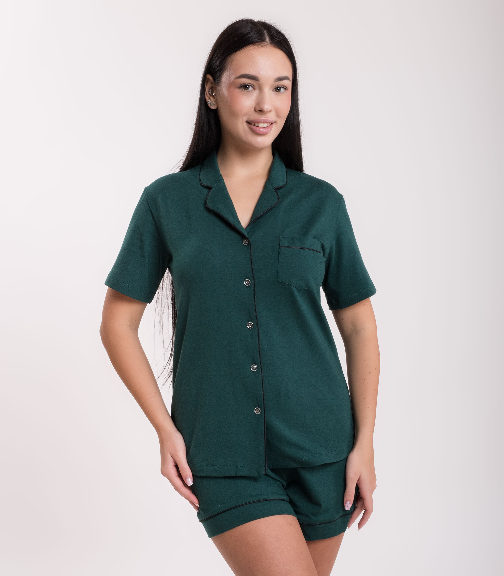 Элегантная пижама с рубашкой с коротким рукавом на пуговицах и накладным грудным карманом. Шорты средней посадки с удобной широкой резинкой на поясе. Модель декорирована кантом. Пижама отлично подходит как для сна, так и для домашнего отдыха.