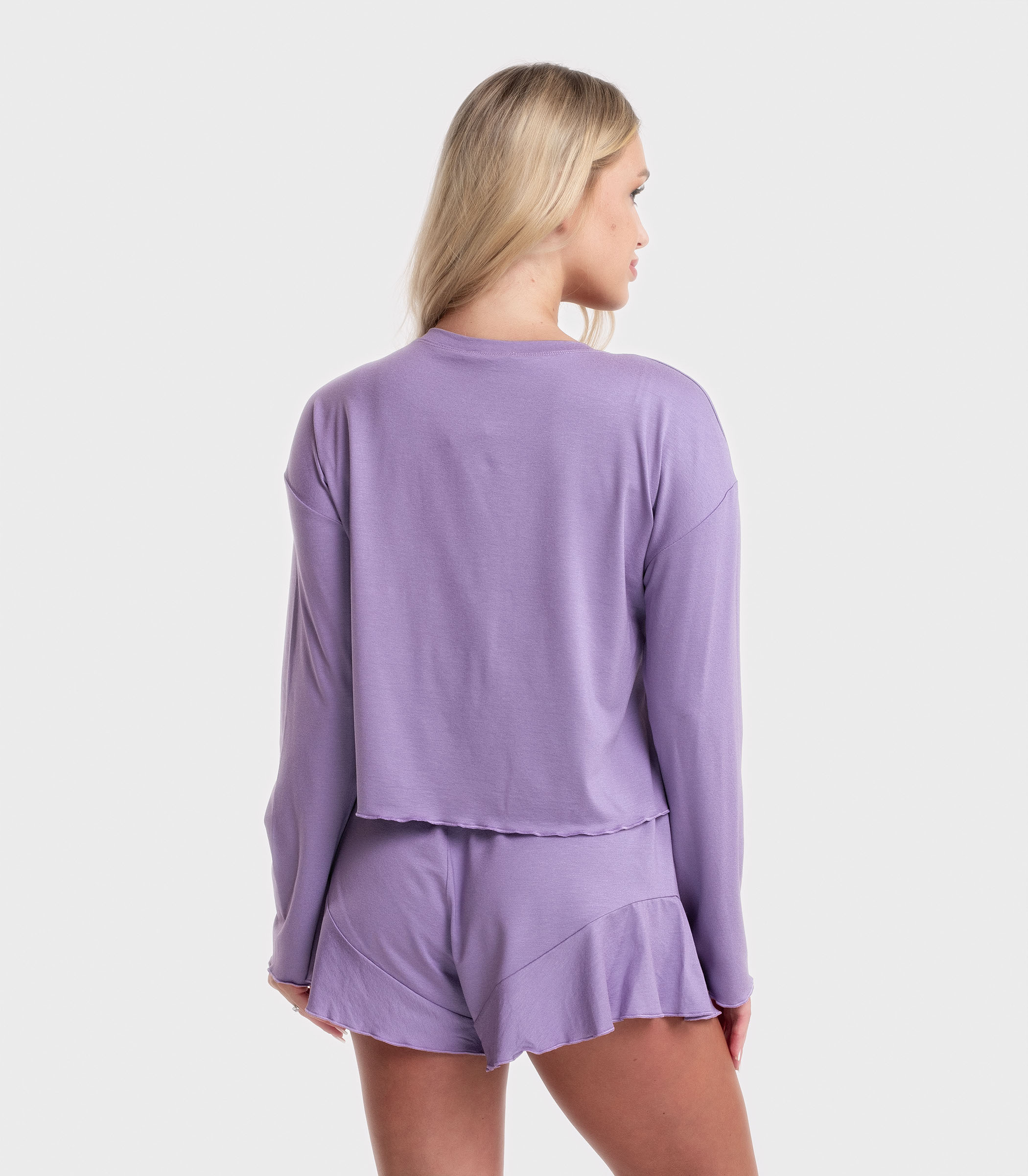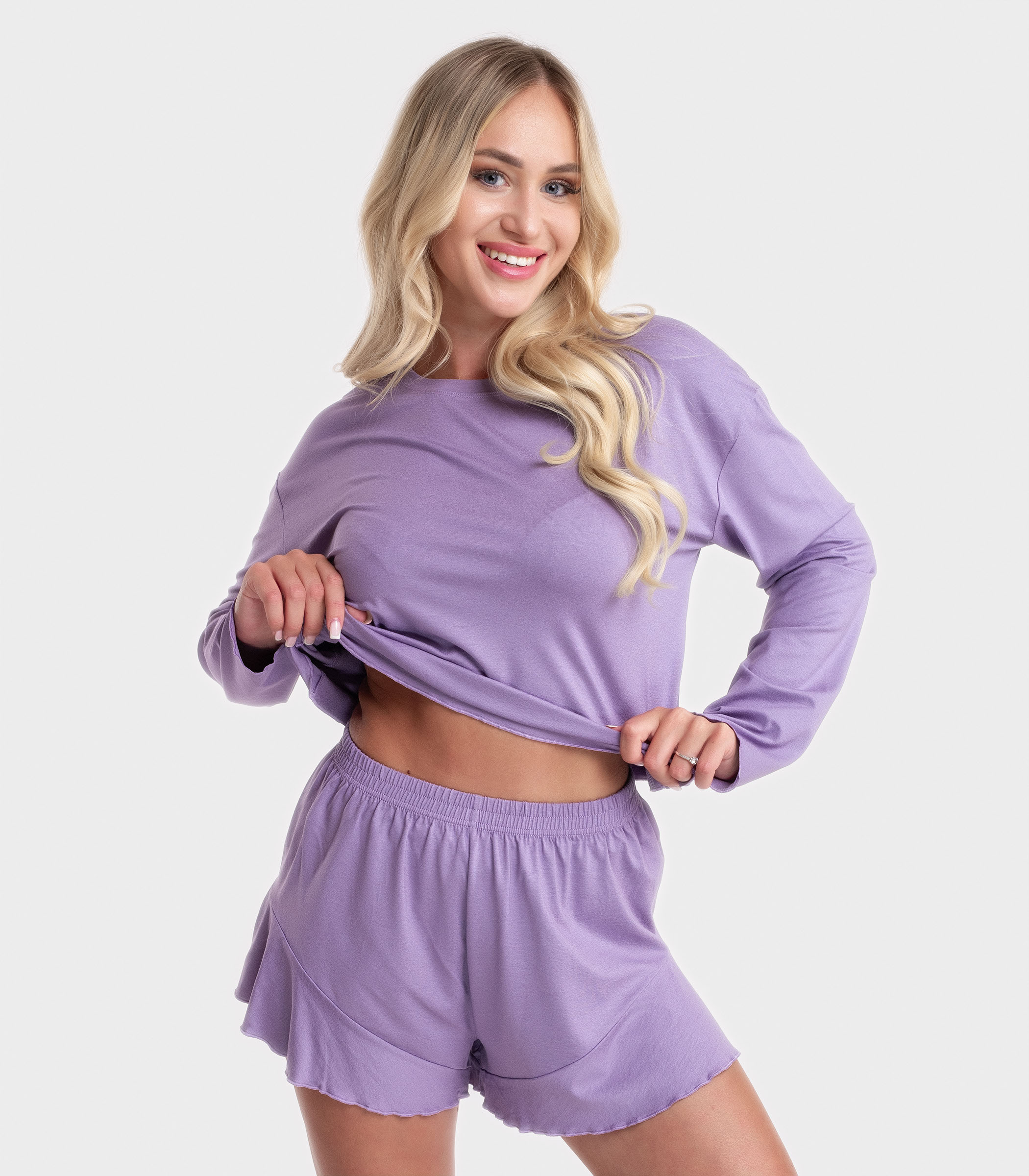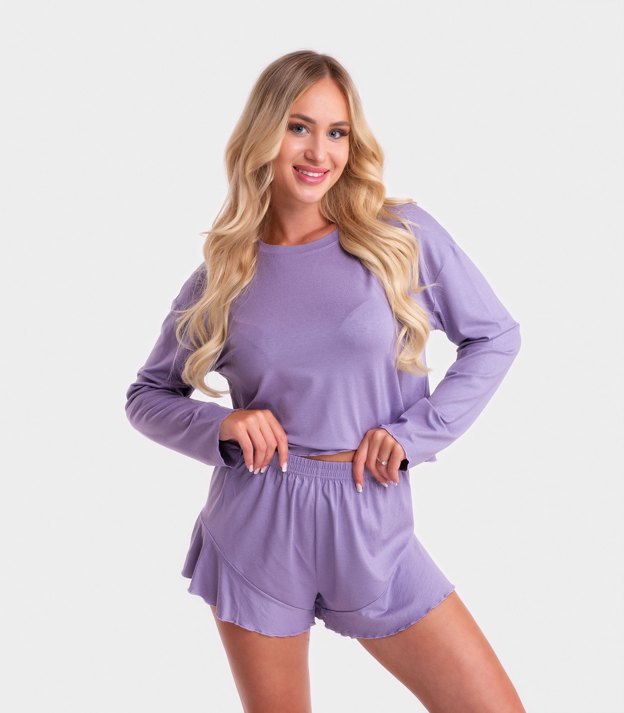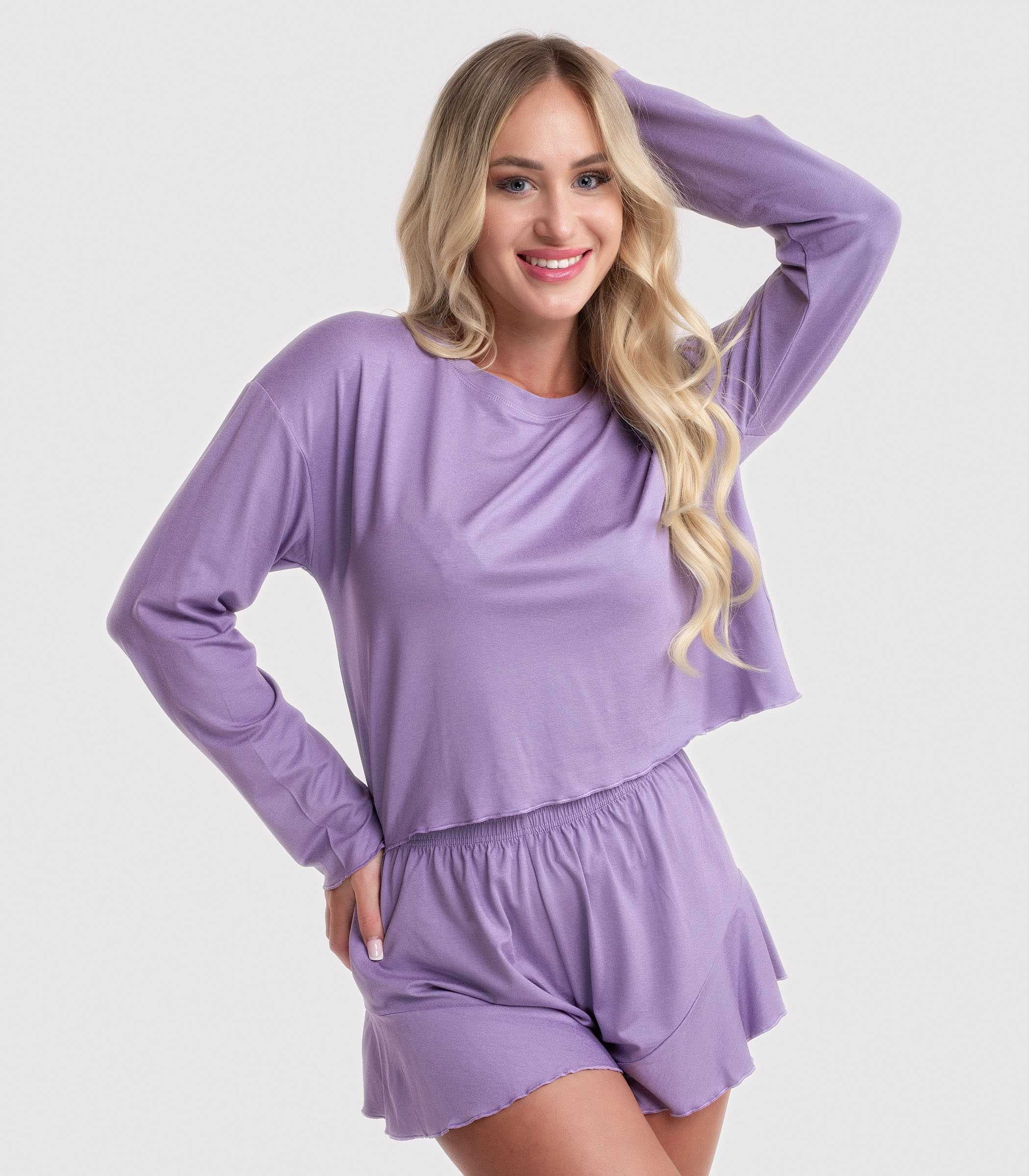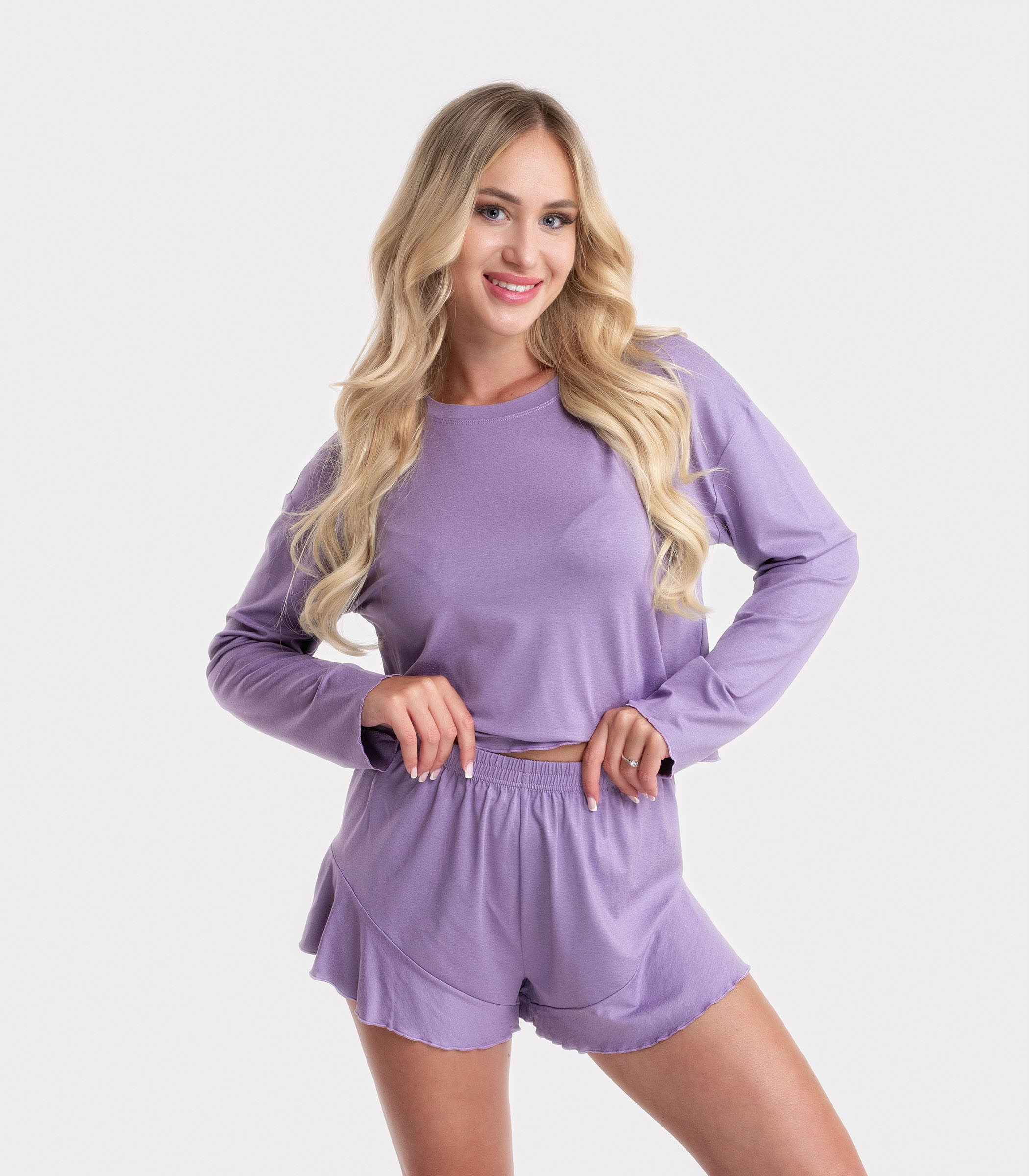 Женская пижамка из вискозы. Джемпер с длинным рукавом и круглым вырезом горловины. Мини-шортики с рюшей по низу изделия.