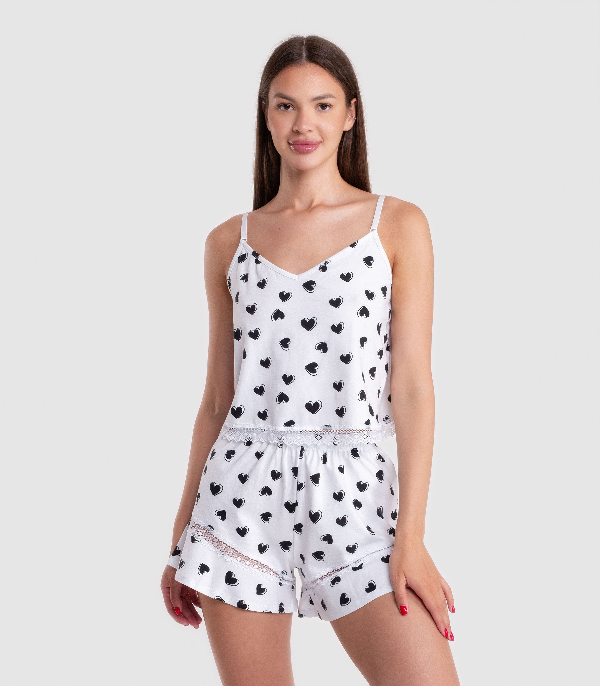 Утонченная пижамка выполнена из мягкого хлопка. Модель на тонких бретелях на регуляции. По низу топа и на шортиках узкое кружево. По низу шорт воланы.