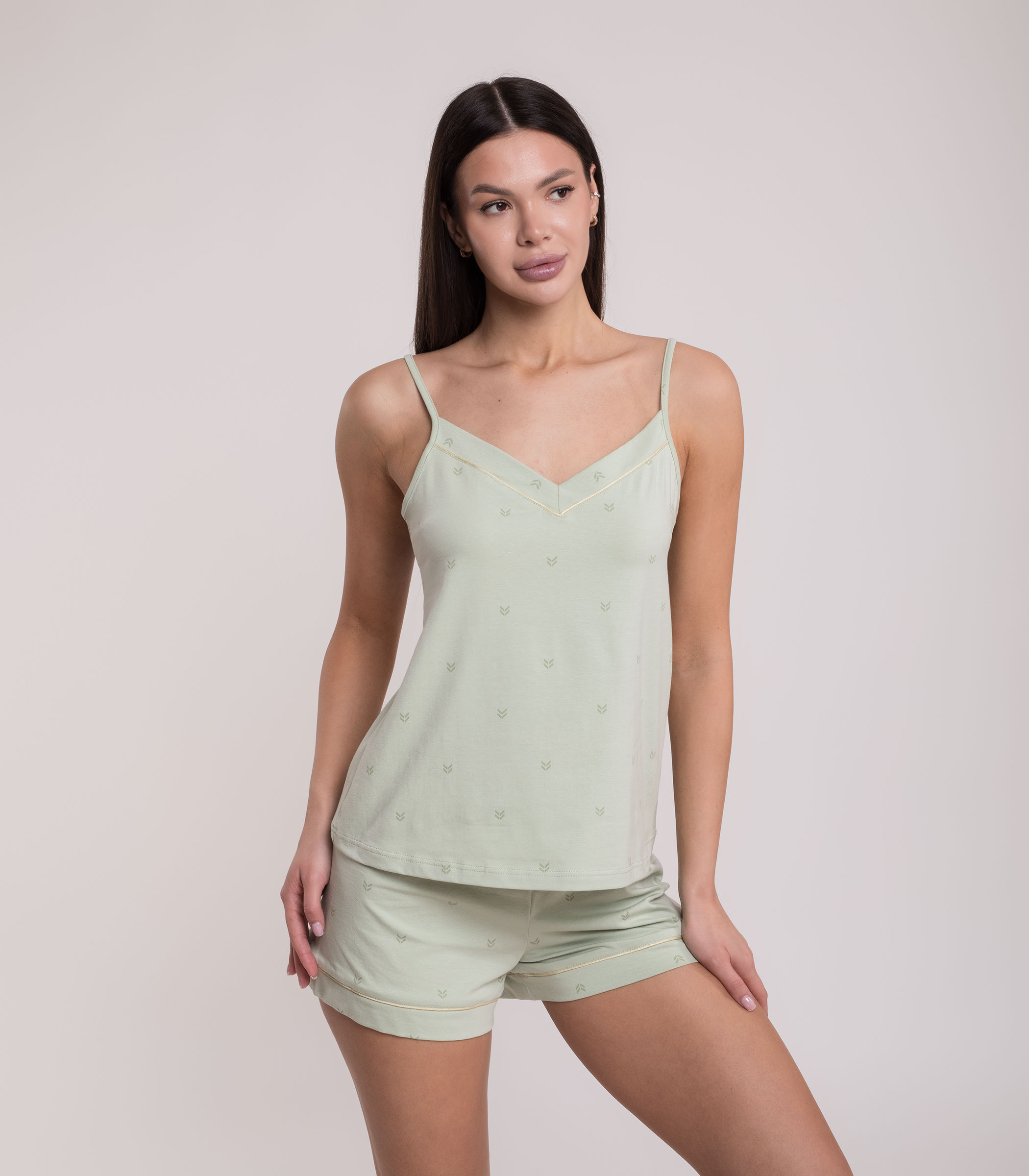Утонченная пижамка выполнена из мягкого хлопкового полотна. Топ на тонких бретелях и мини-шортики эффектно смотрятся на фигуре и не сковывают движения. Сочетание элегантного дизайна и нежной ткани делает этот комплект идеальным выбором для домашних вечеров.;