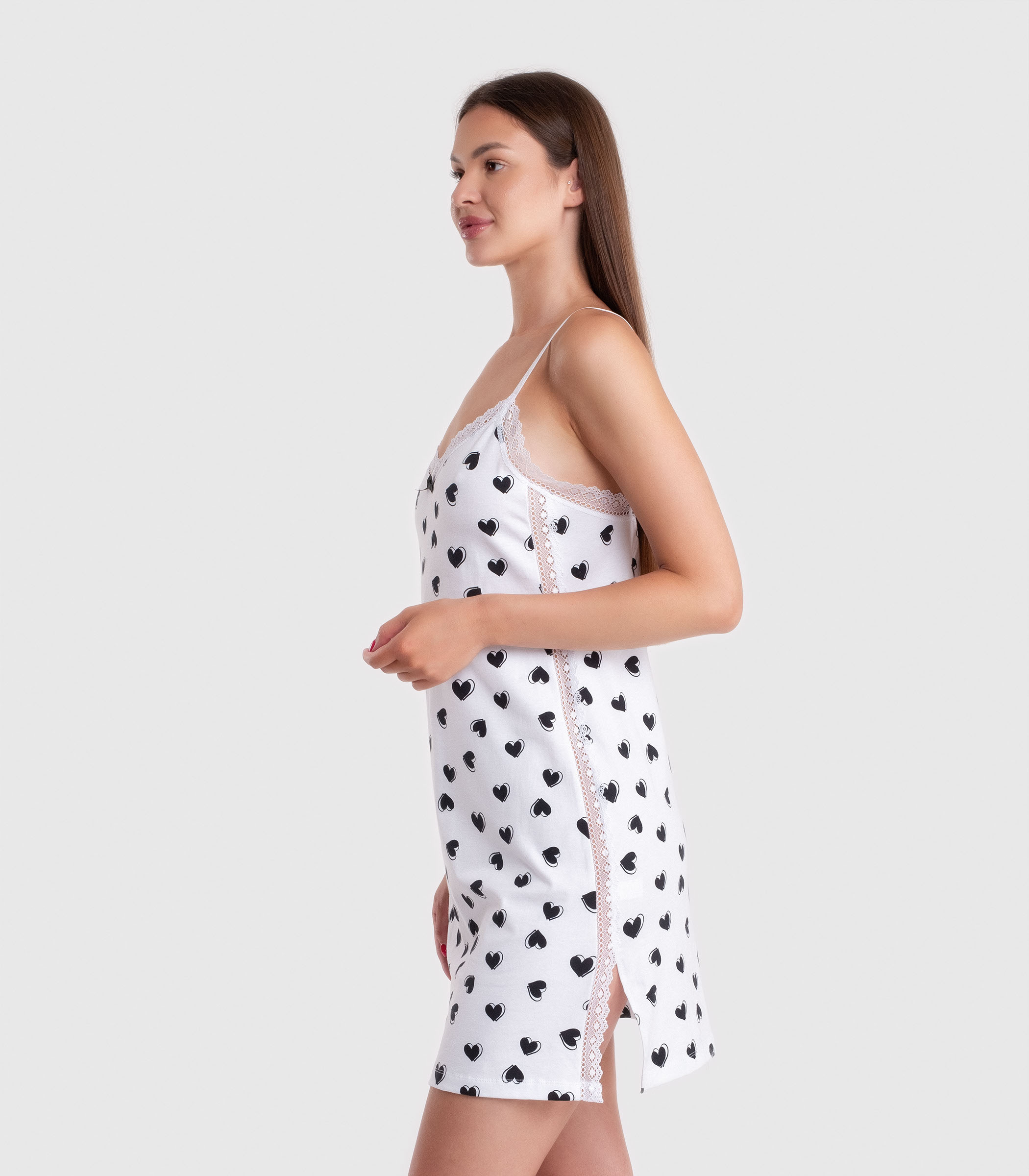 Утонченная ночная сорочка выполнена из мягкого хлопка с добавлением эластана. Модель приталенного силуэта на тонких бретелях. Сорочка декорирована ажурным кружевом по всей длине и милым бантиком на груди.