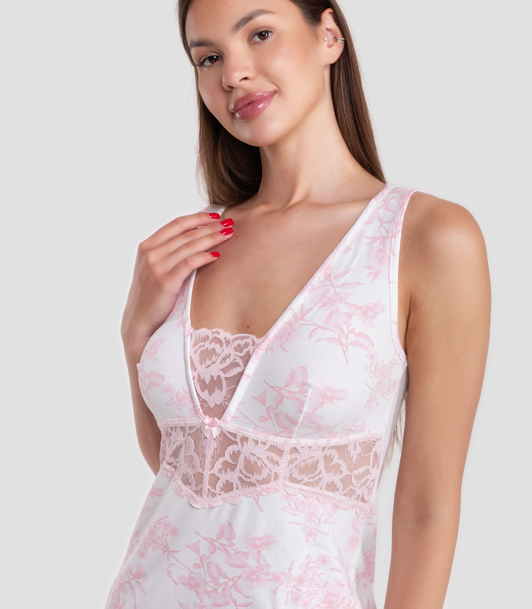 Сорочка на широких бретелях полуприталенного силуэта выполнена из высококачественного хлопка. Модель с V-образным вырезом горловины. Сорочка отрезная под грудью, с кружевной вставкой на передней детали.