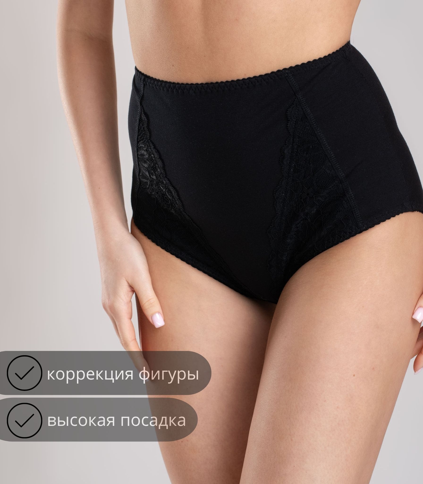 Корректирующая модель трусов с завышенной талией. За счет эластичности и нежности полотна белье комфортно сидит на фигуре и не сковывает движения. Хлопковые трусы дополнены ажурным кружевом.;