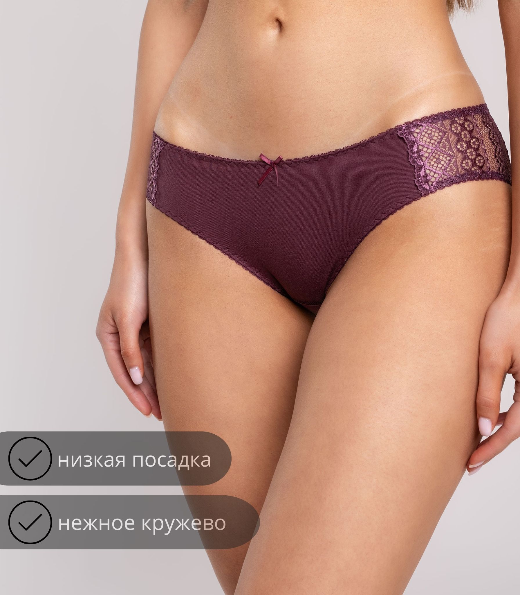 Базовые трусики на низкой посадке выполнены из мягкого хлопкового полотна. Модель декорирована кружевными вставками по бокам. Посадка и мягкие швы обеспечивают комфорт и удобство в использовании.;