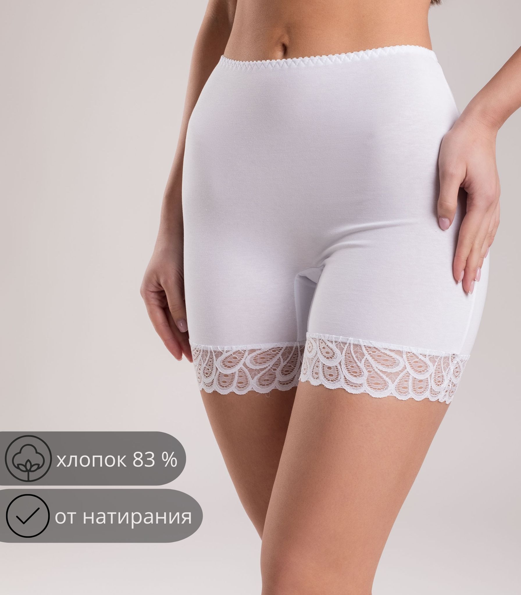 Трусы-панталоны женские на высокой посадке выполнены из хлопкового полотна с добавлением эластана. По краю панталоны декорированы эластичным кружевом, что позволяет аккуратно облегать любую полноту ноги, не перетягивая бедро.