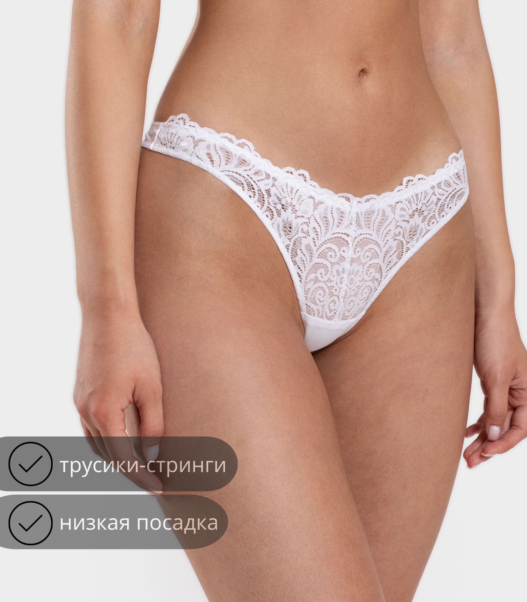 Утонченные трусики-стринги на заниженной посадке. Передняя деталь выполнена из мягкого ажурного кружева. Благодаря крою и посадке, они идеально сидят на фигуре и не вызывают дискомфорта.