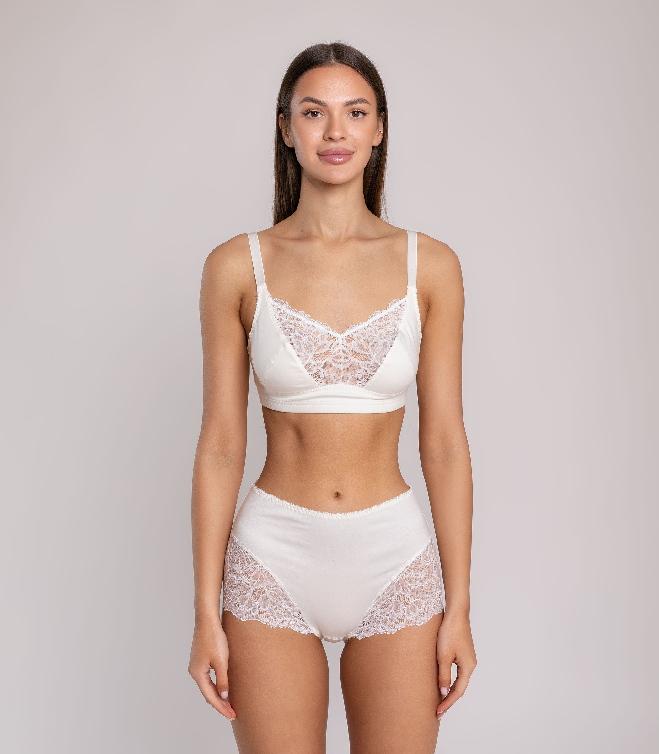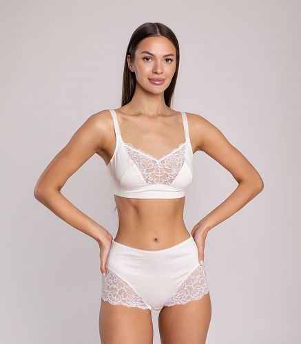 Комфортные трусики-слипы выполнены из высококачественного хлопкового полотна. Модель закрытого кроя на высокой талии. По ножкам ажурные кружевные детали;