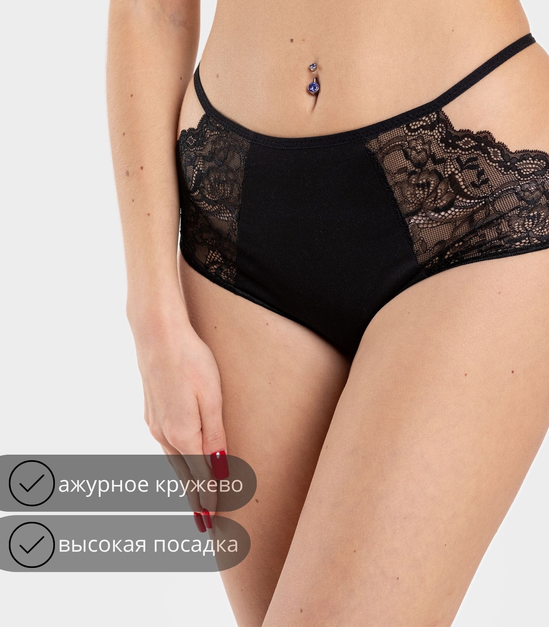 Завышенные кружевные трусики выгодно подчеркнут талию и округлость бедер, делая вашу фигуру бесподобной.