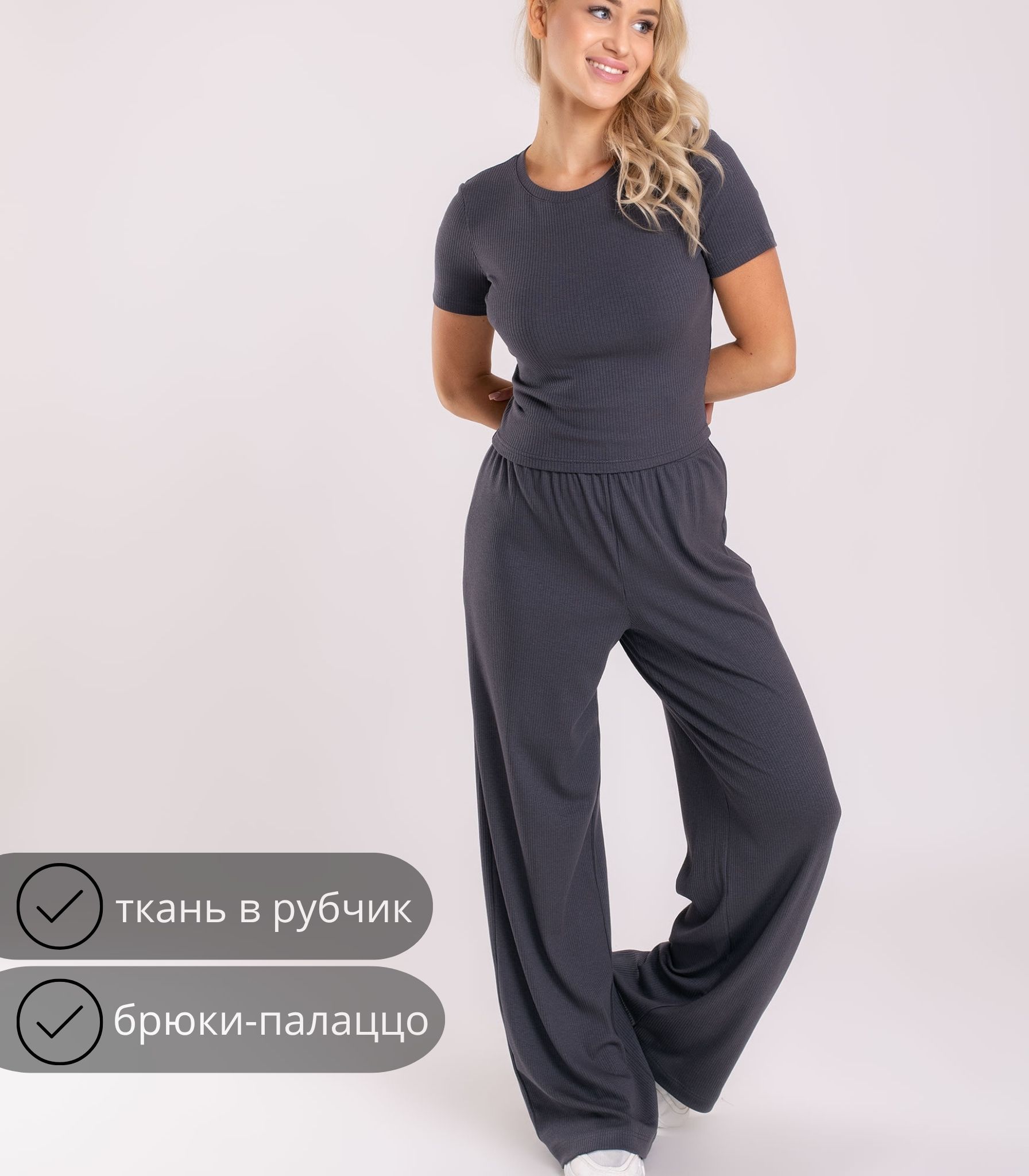 Женские брюки-палаццо выполнены из кашкорсе лапша. Модель с комфортной мягкой резинкой на талии. Брюки из модала и хлопка мягкие и струящиеся, обеспечивают комфорт и полную свободу движений.;