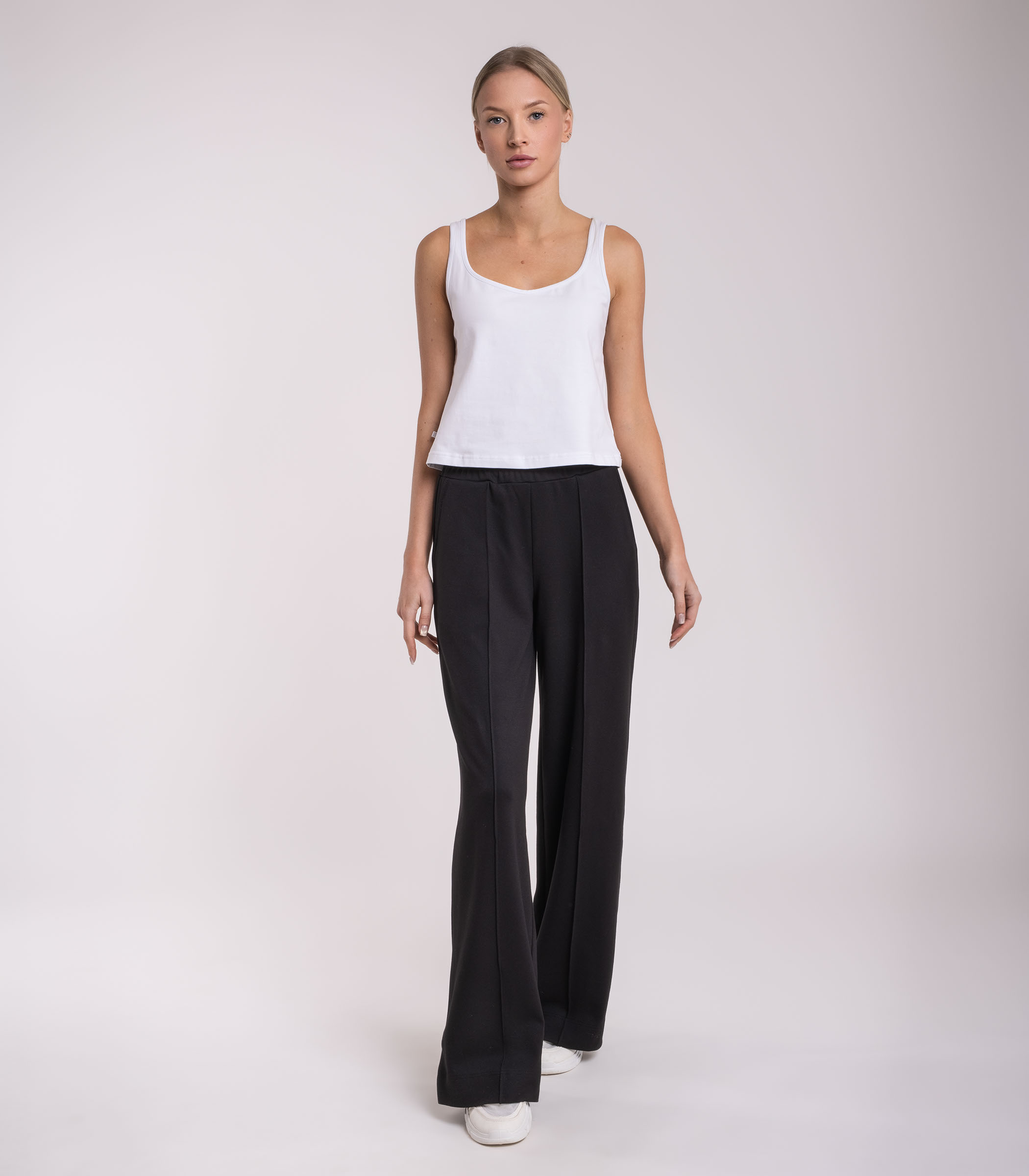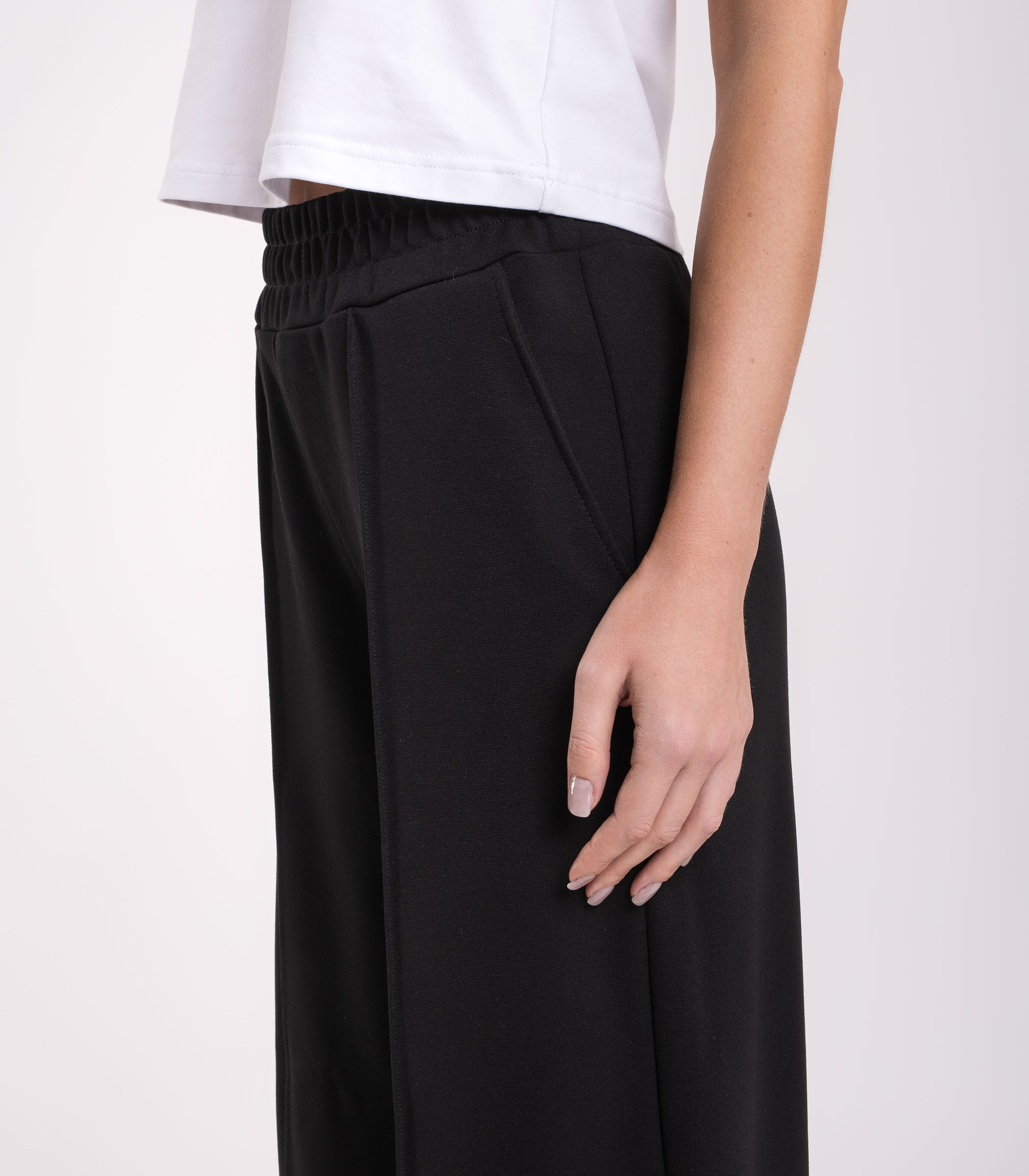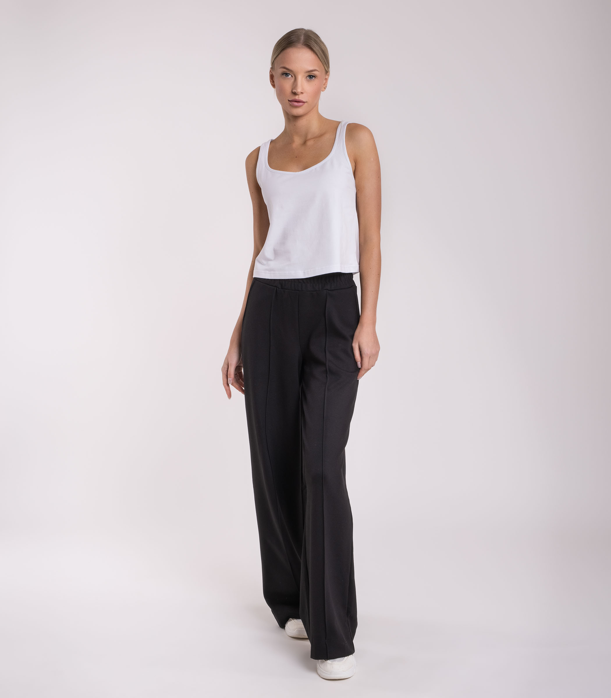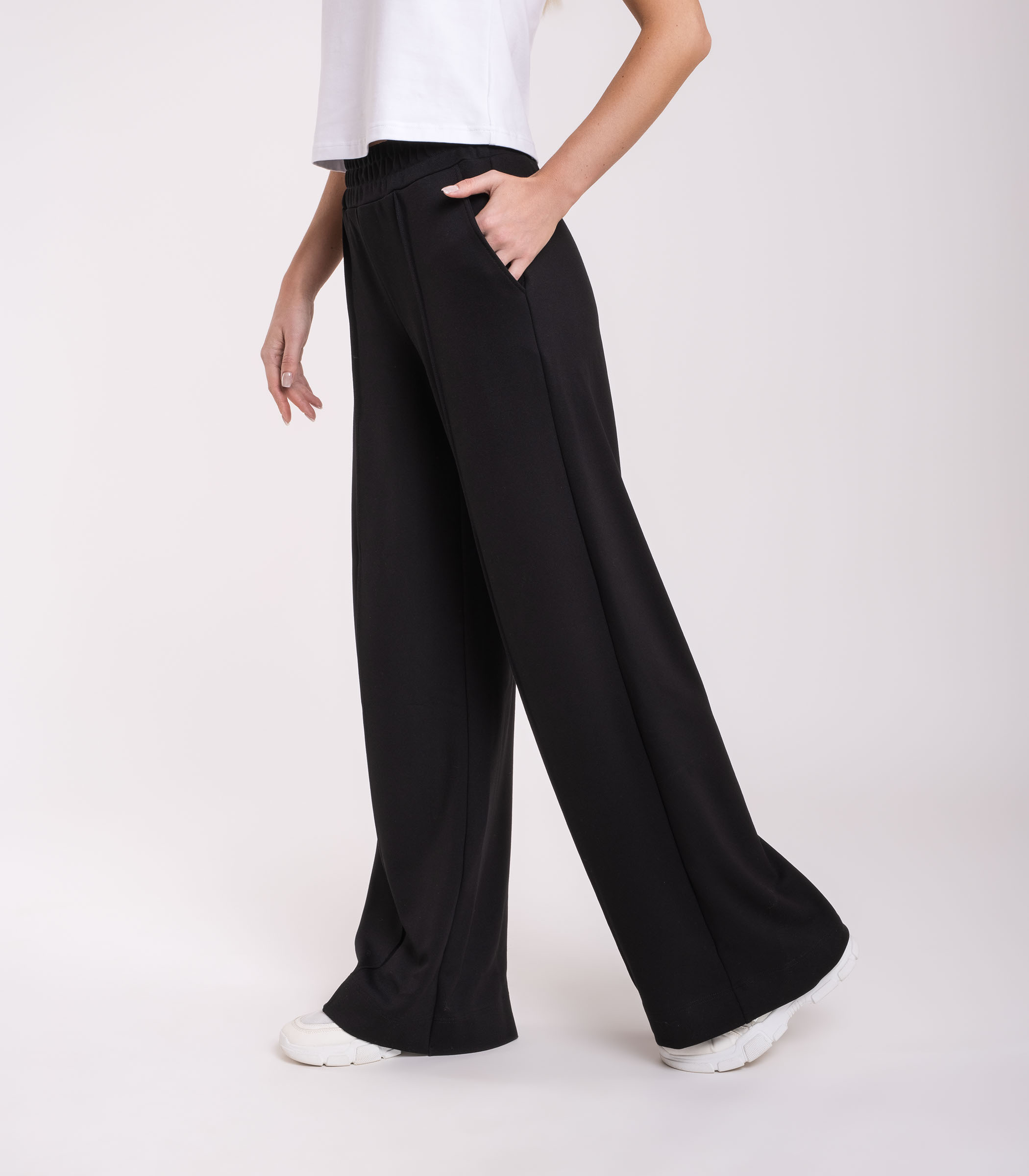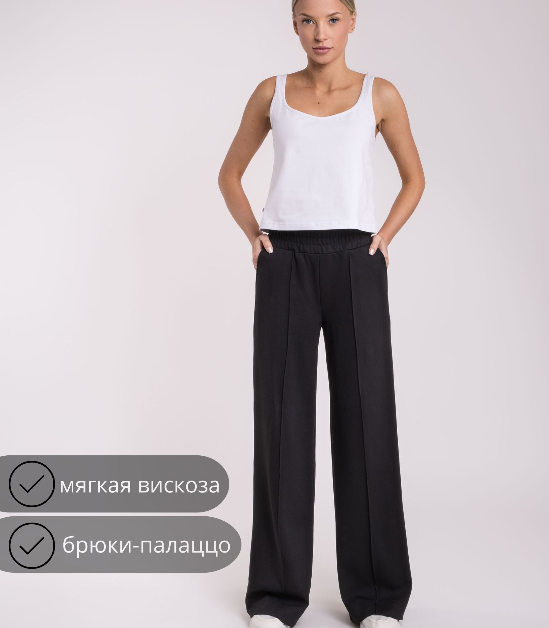 Брюки-палаццо с завышенной посадкой на талии, простроченной стрелкой, удобными боковыми карманами и поясом на широкой резинке. Эффектная модель идеальна для уличного стиля и удобна для носки дома.
