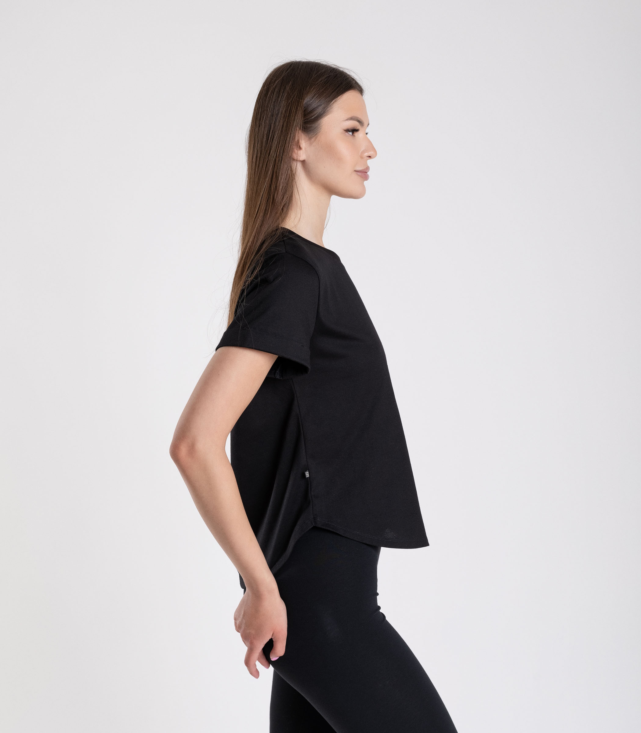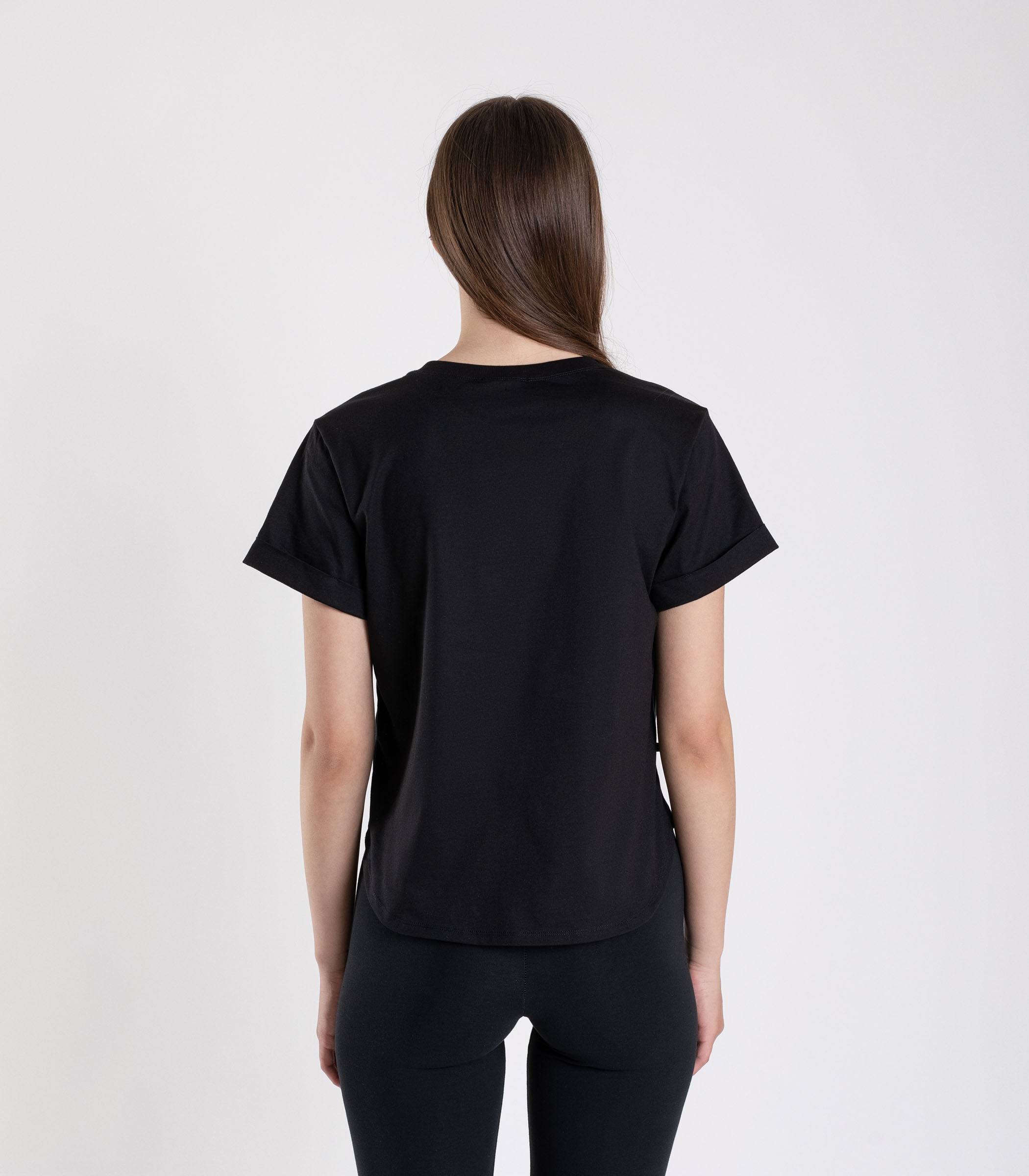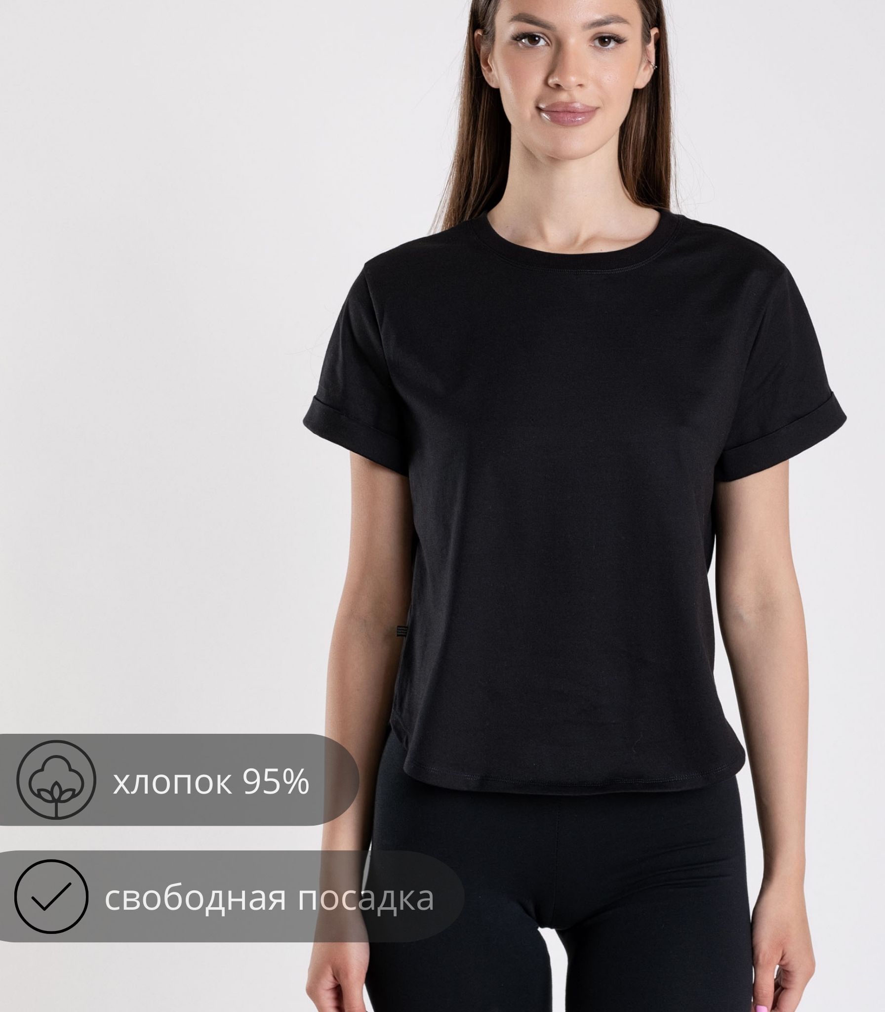 Базовая футболка с подворотами на рукавах выполнена из мягкого хлопкового полотна. Она приятна к телу и обеспечивает комфорт в носке. Модель свободного силуэта, укороченная хорошо сидит на разных типах фигуры и отлично сочетается с любой вещью в вашем гардеробе.