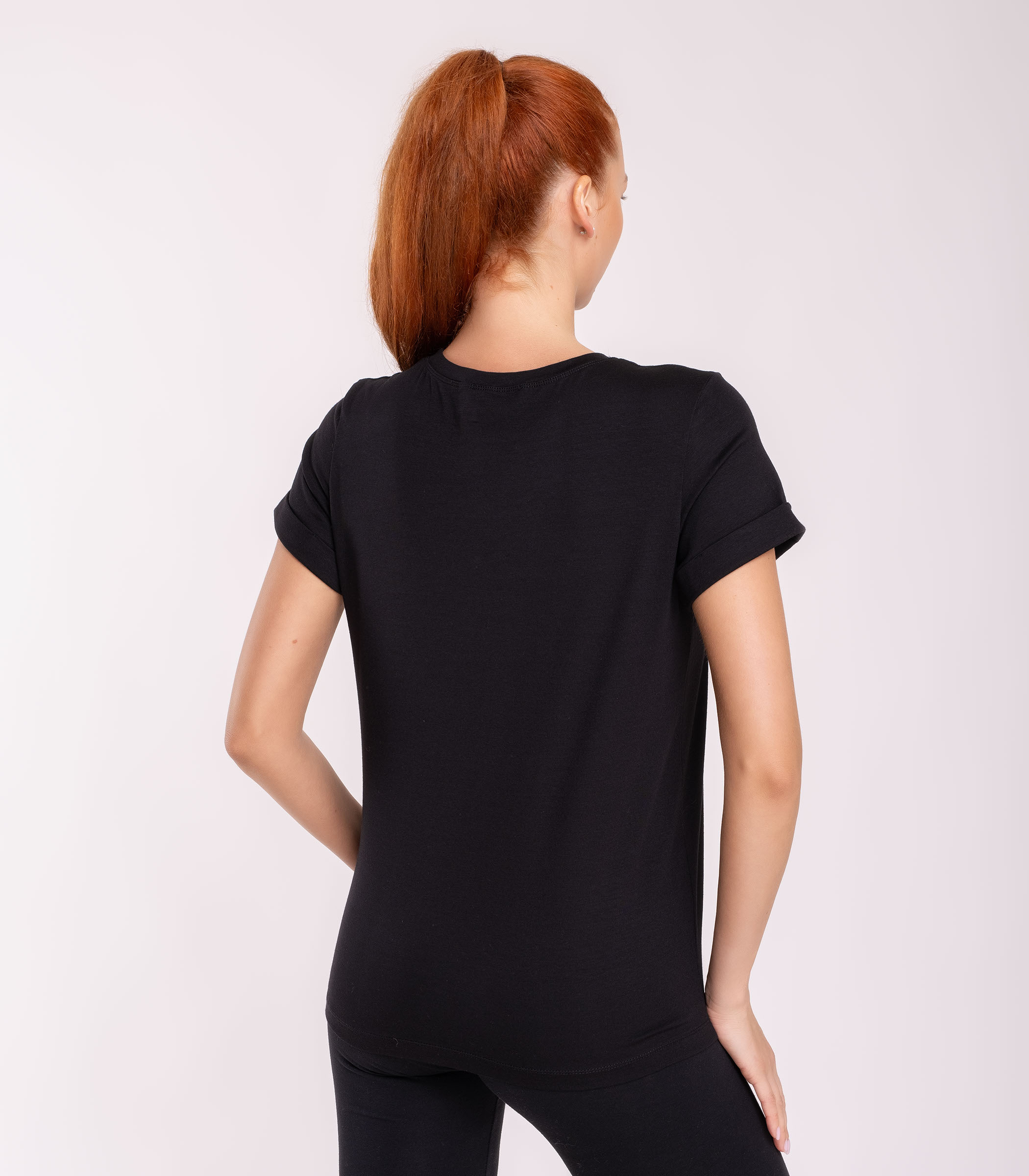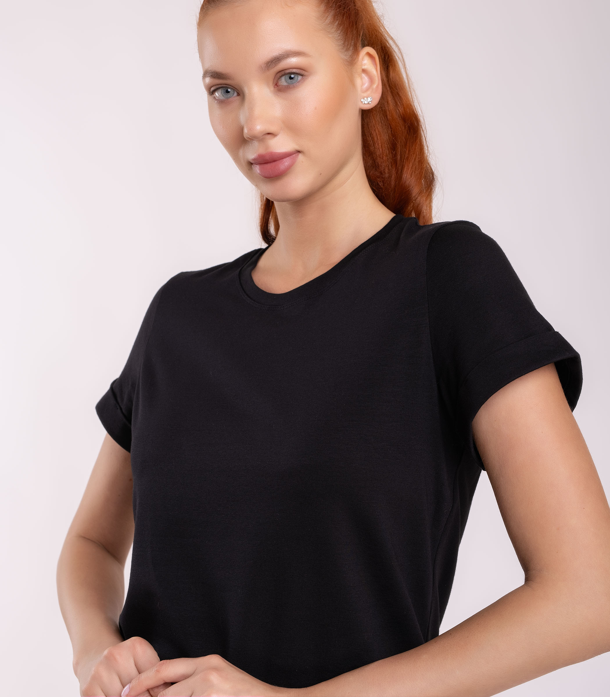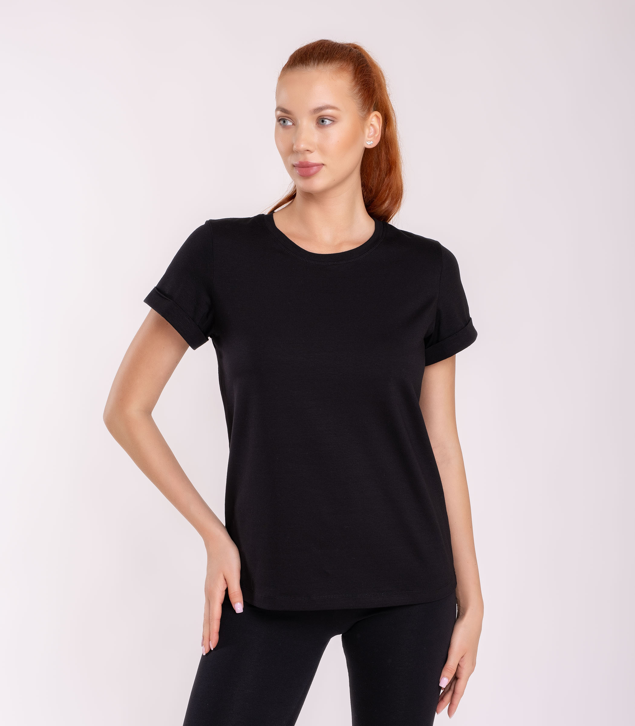Базовая футболка с подворотами на рукавах выполнена из мягкого хлопкового полотна. Она приятна к телу и обеспечивает комфорт в носке. Модель свободного силуэта, укороченная хорошо сидит на разных типах фигуры и отлично сочетается с любой вещью в вашем гардеробе.;