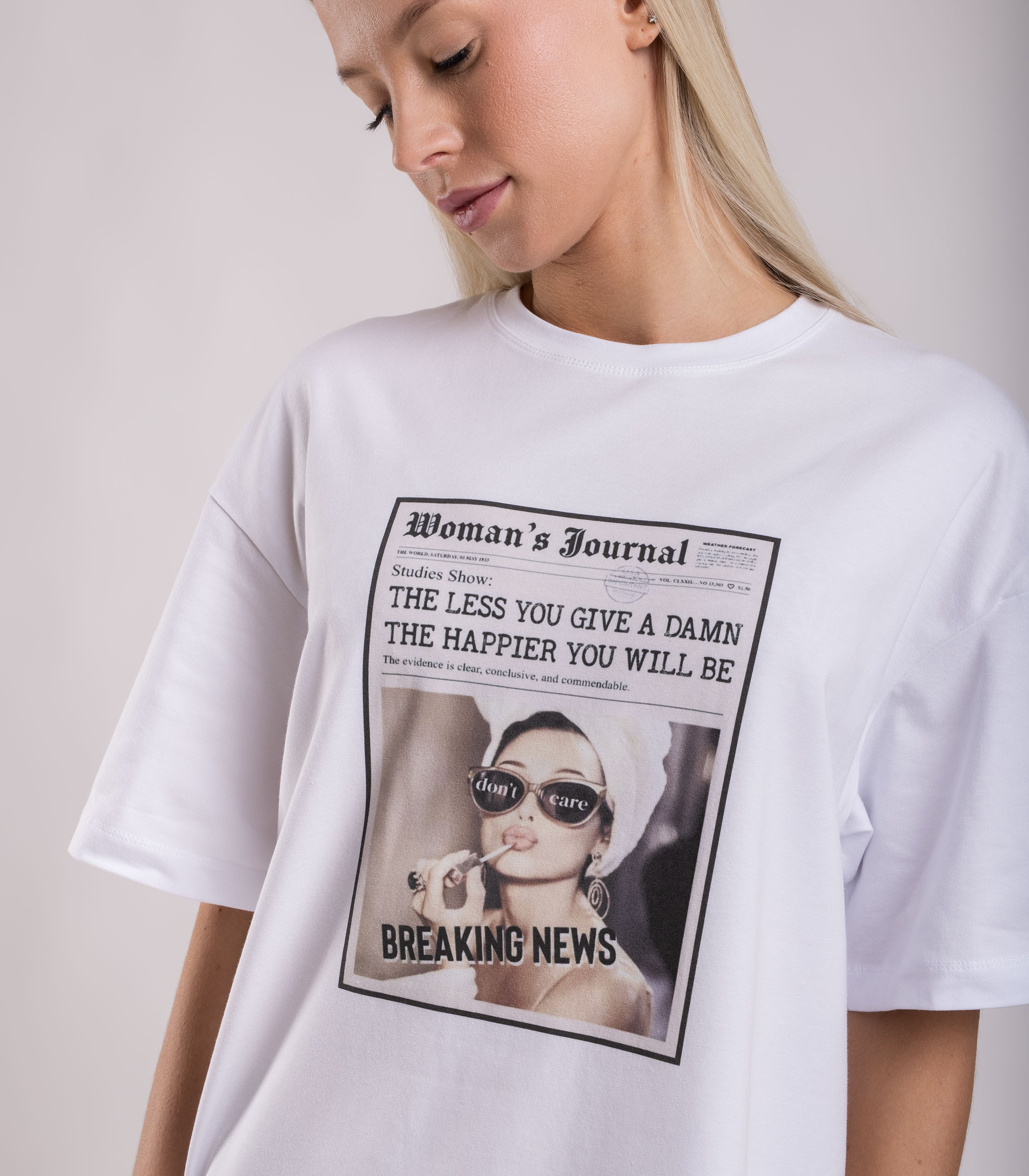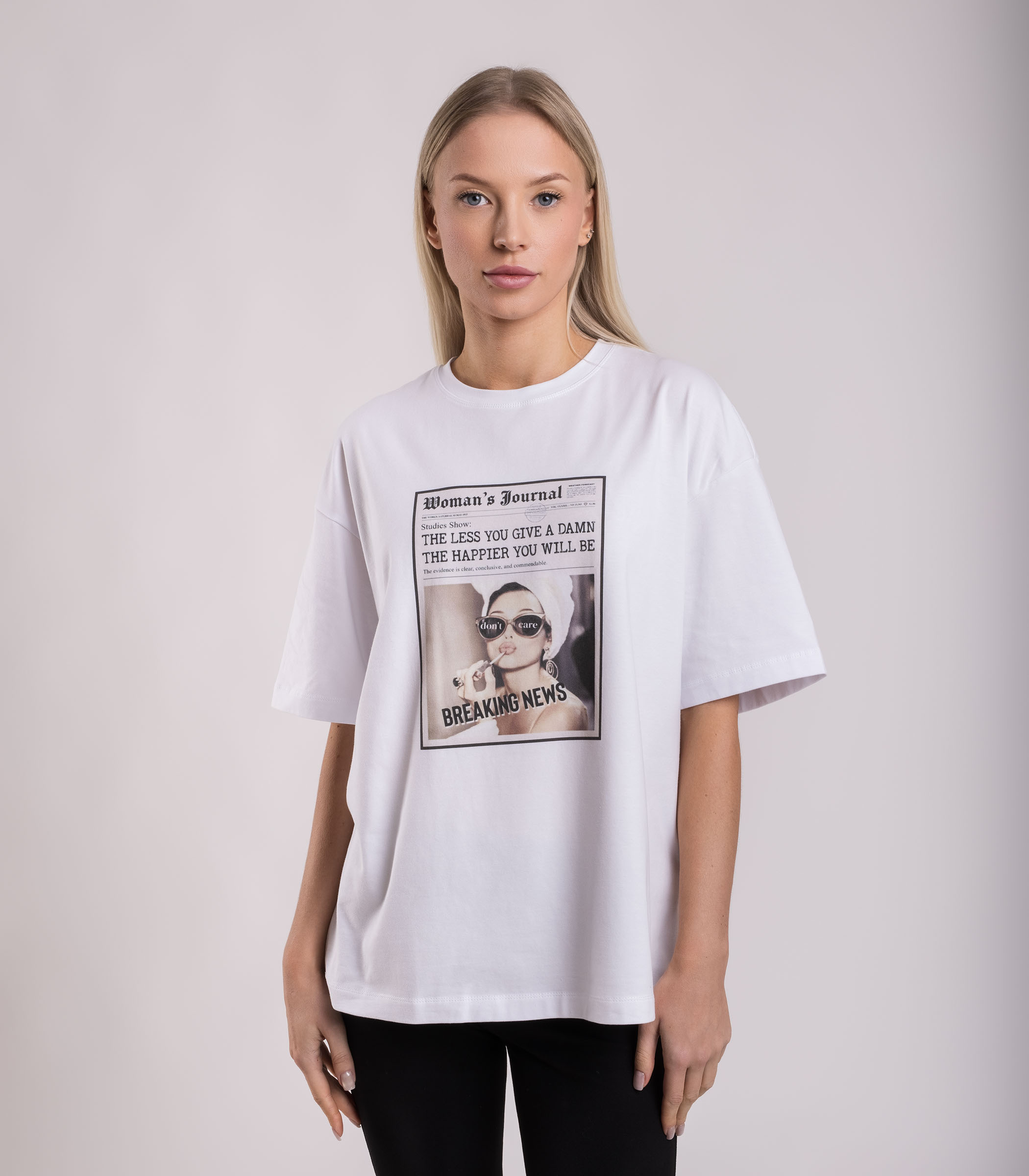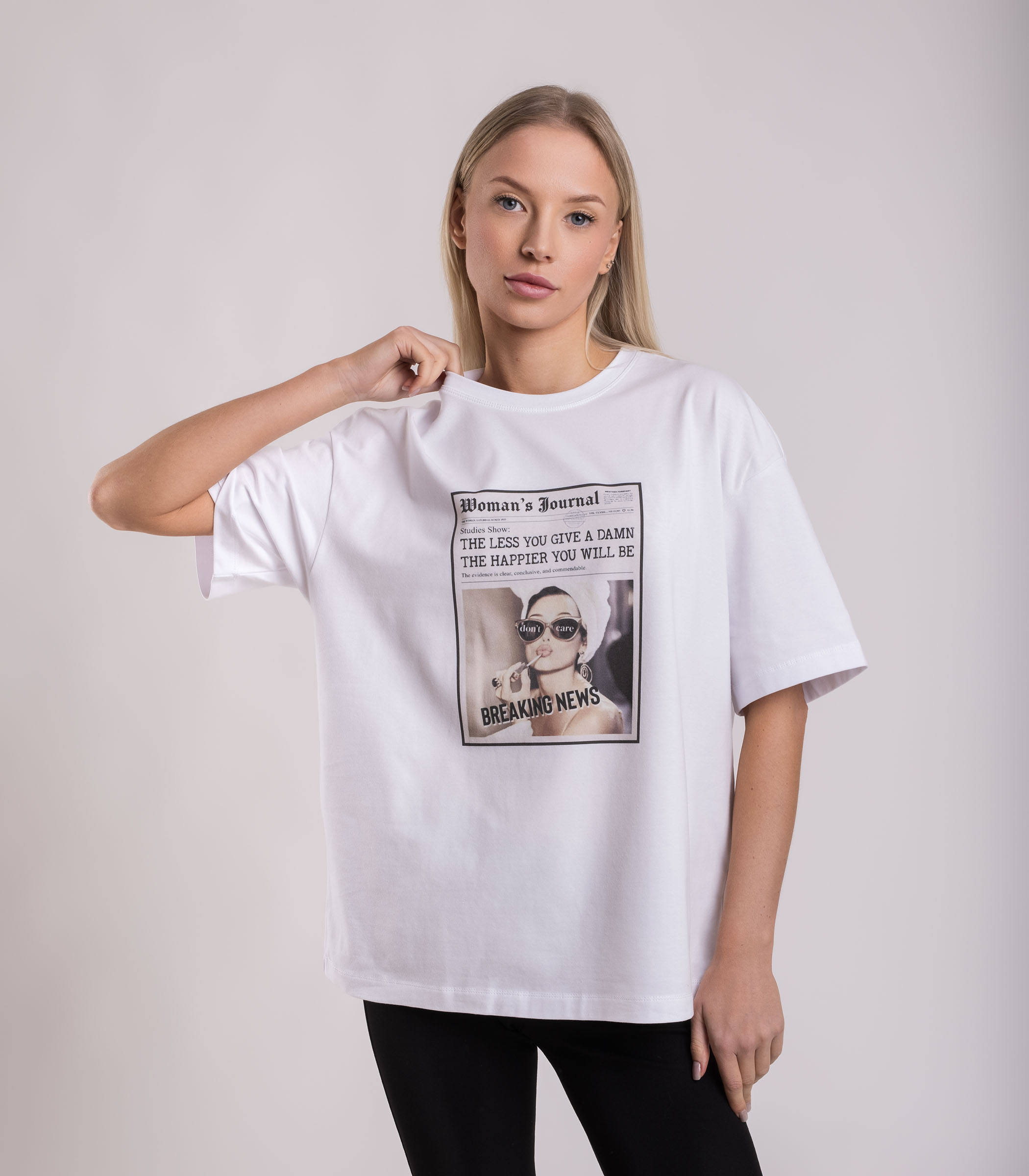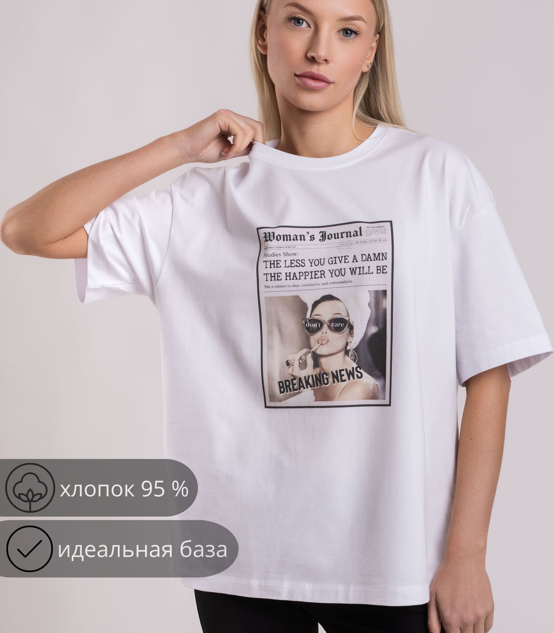 Базовая женская футболка с принтом выполнена из высококачественного трикотажного материала, состоящего из хлопка и эластана. Это обеспечивает мягкость, комфорт и отличную посадку на теле. Прямой свободный крой не сковывает движения и легко сочетается с различными низами.;