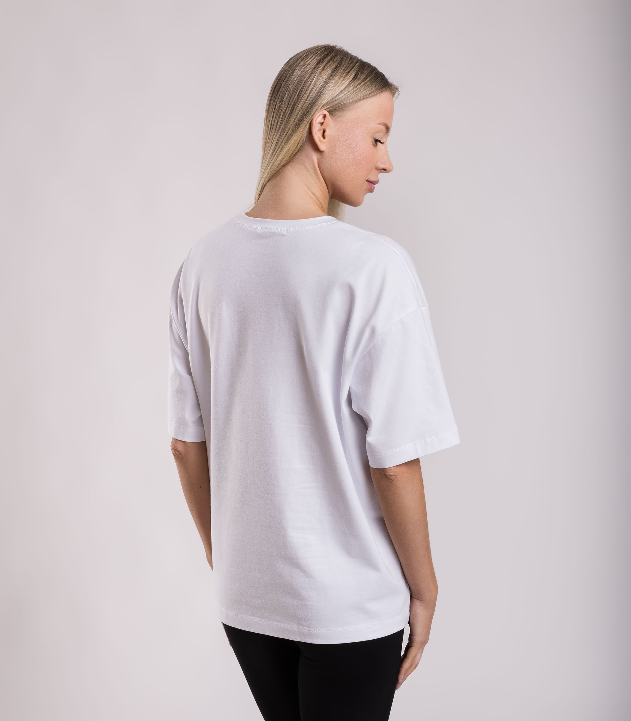 Базовая женская футболка с принтом выполнена из высококачественного трикотажного материала, состоящего из хлопка и эластана. Это обеспечивает мягкость, комфорт и отличную посадку на теле. Прямой свободный крой не сковывает движения и легко сочетается с различными низами.