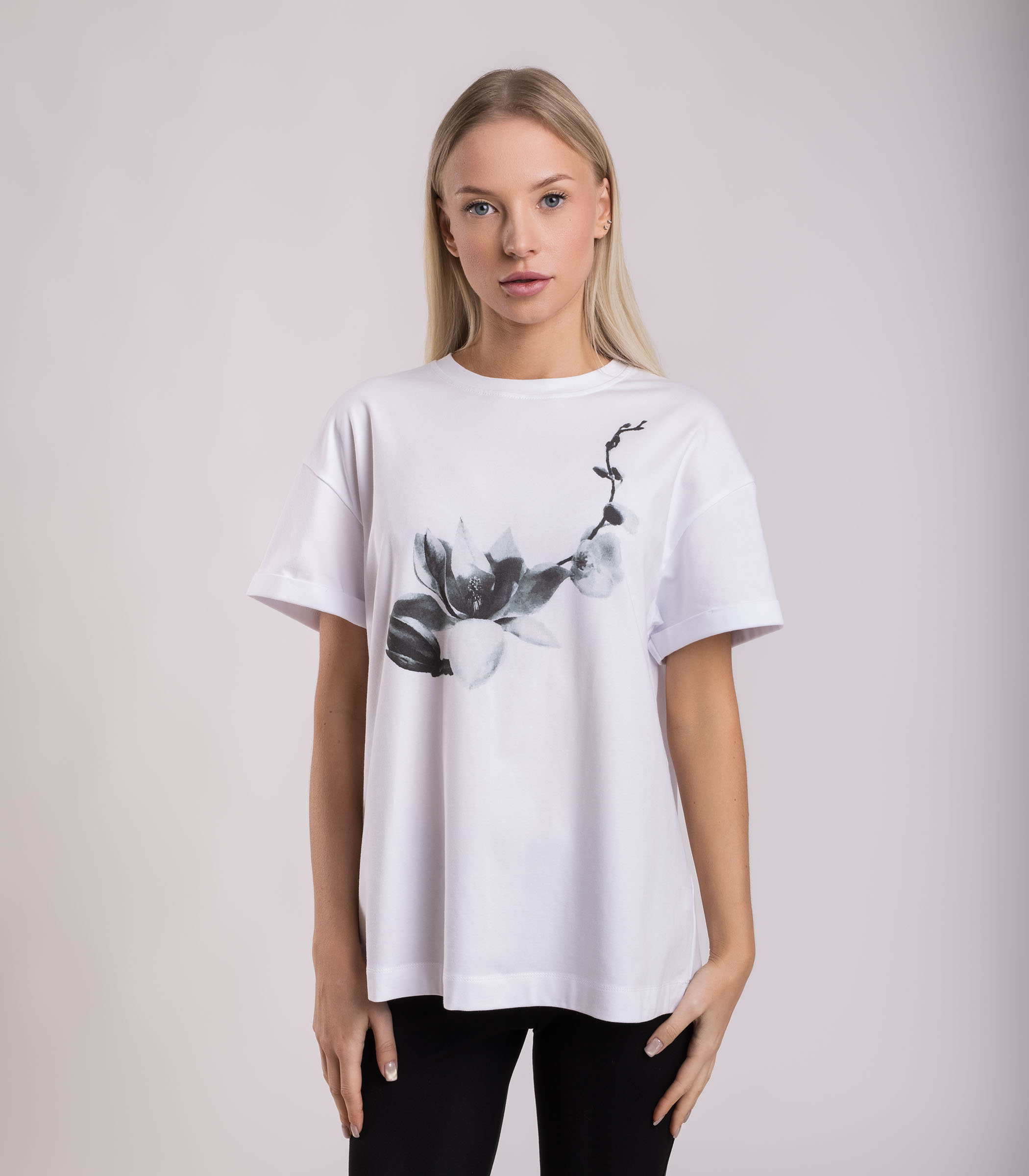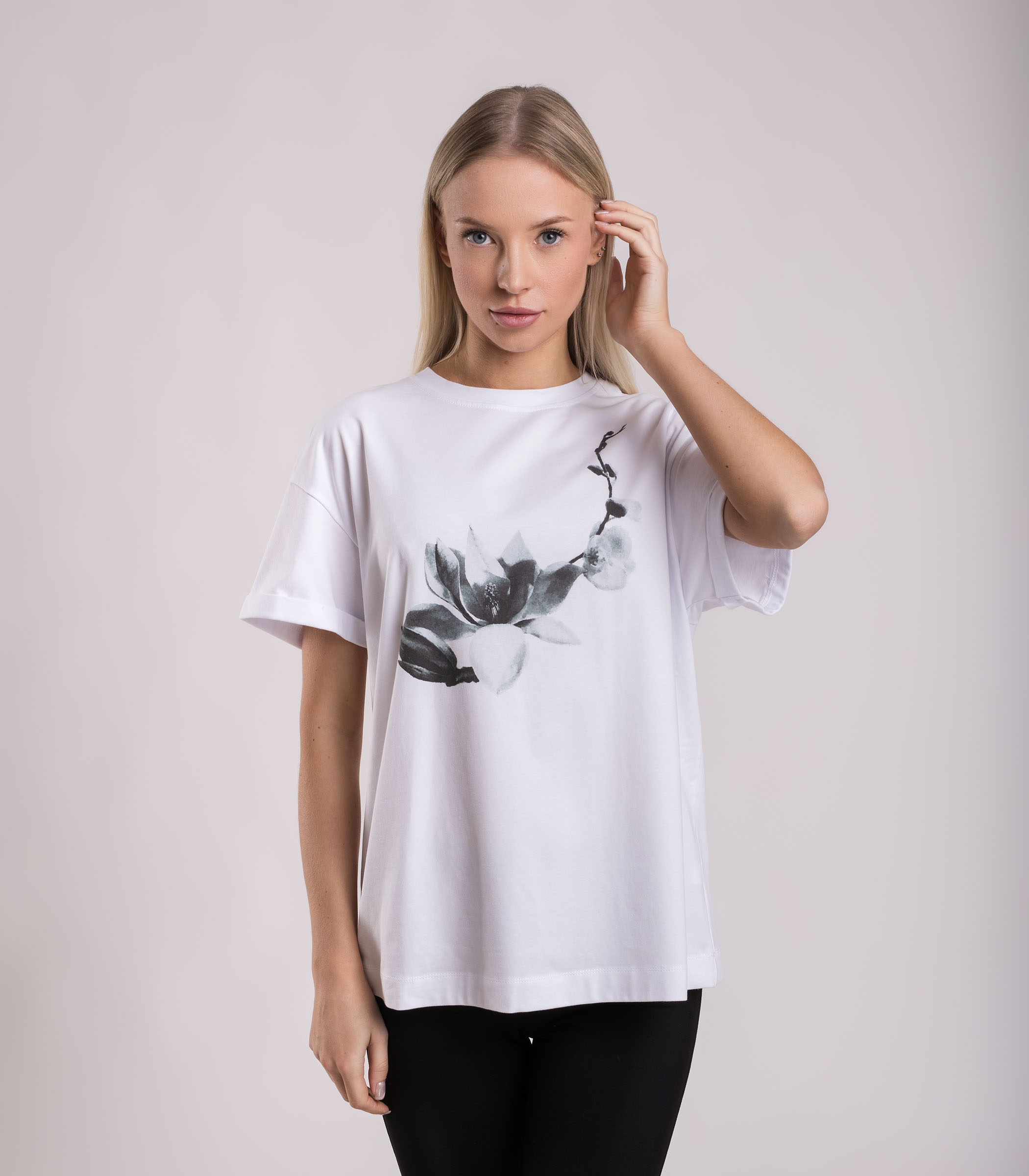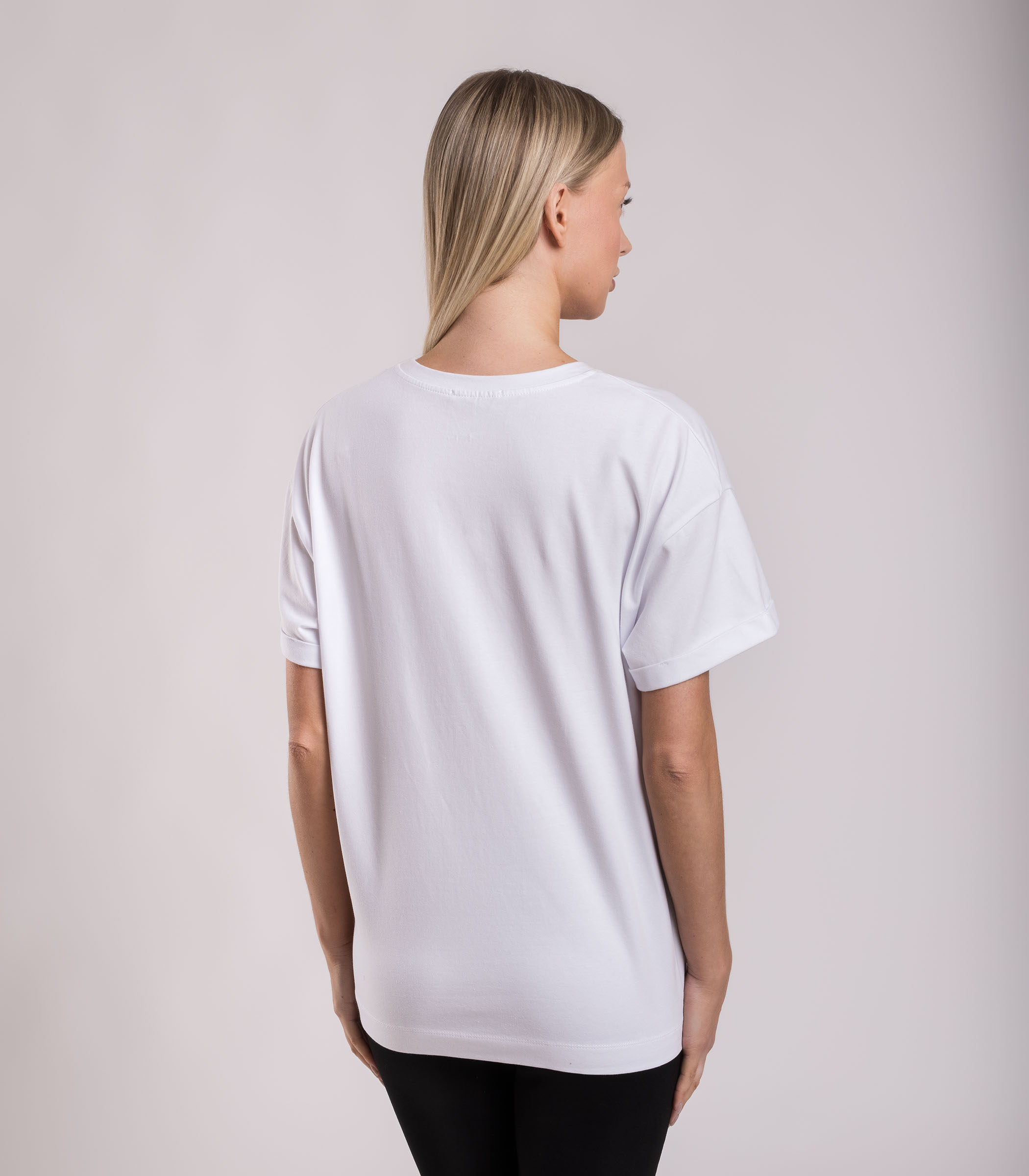 Базовая женская футболка с принтом выполнена из высококачественного трикотажного материала, состоящего из хлопка и эластана. Это обеспечивает мягкость, комфорт и отличную посадку на теле. Прямой свободный крой не сковывает движения и легко сочетается с различными низами.