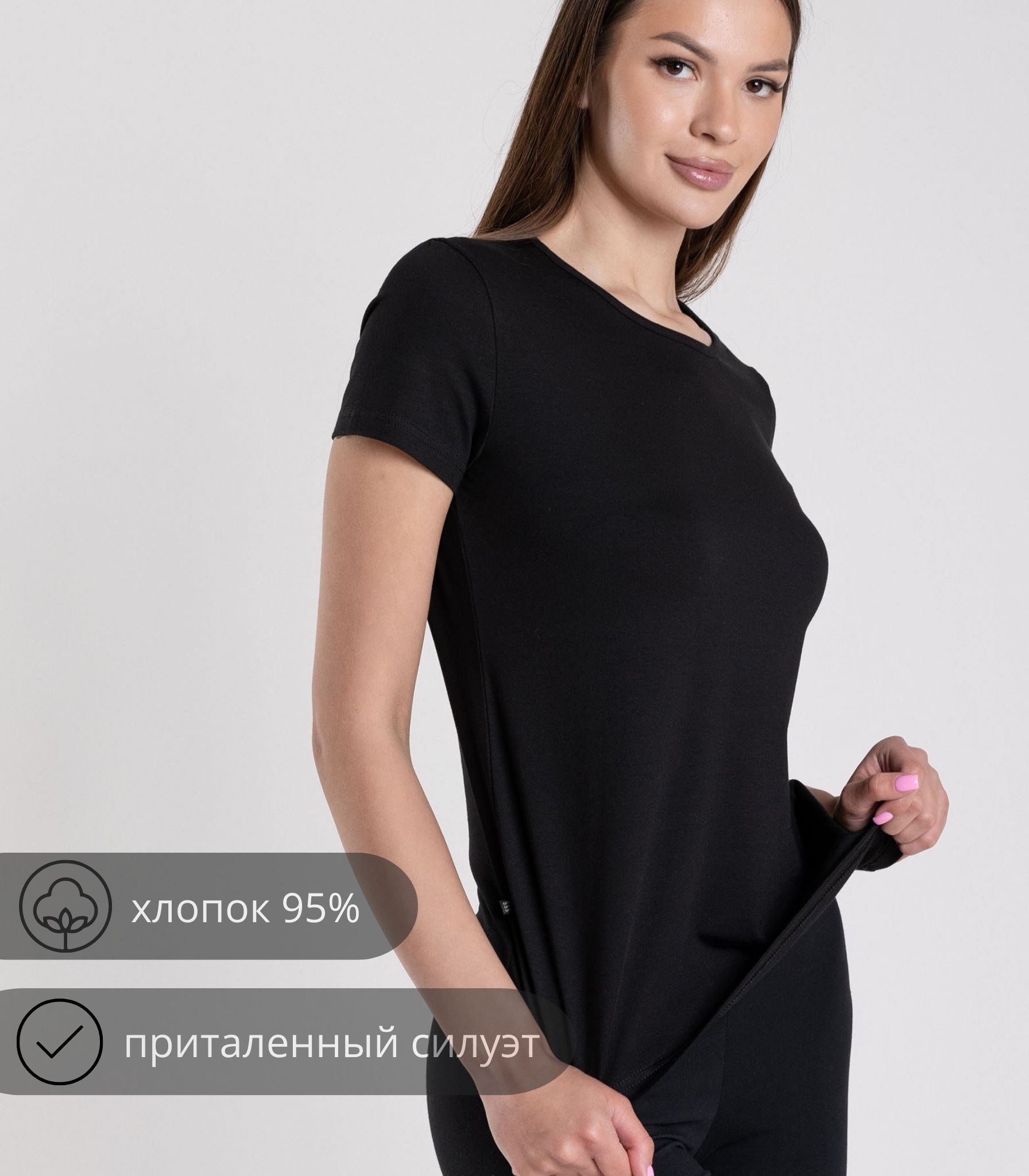 Женская фуфайка выполнена из мягкого хлопкового полотна. Модель с коротким рукавом и круглым вырезом. Лаконичная фуфайка станет отличной базой для создания модных образов.