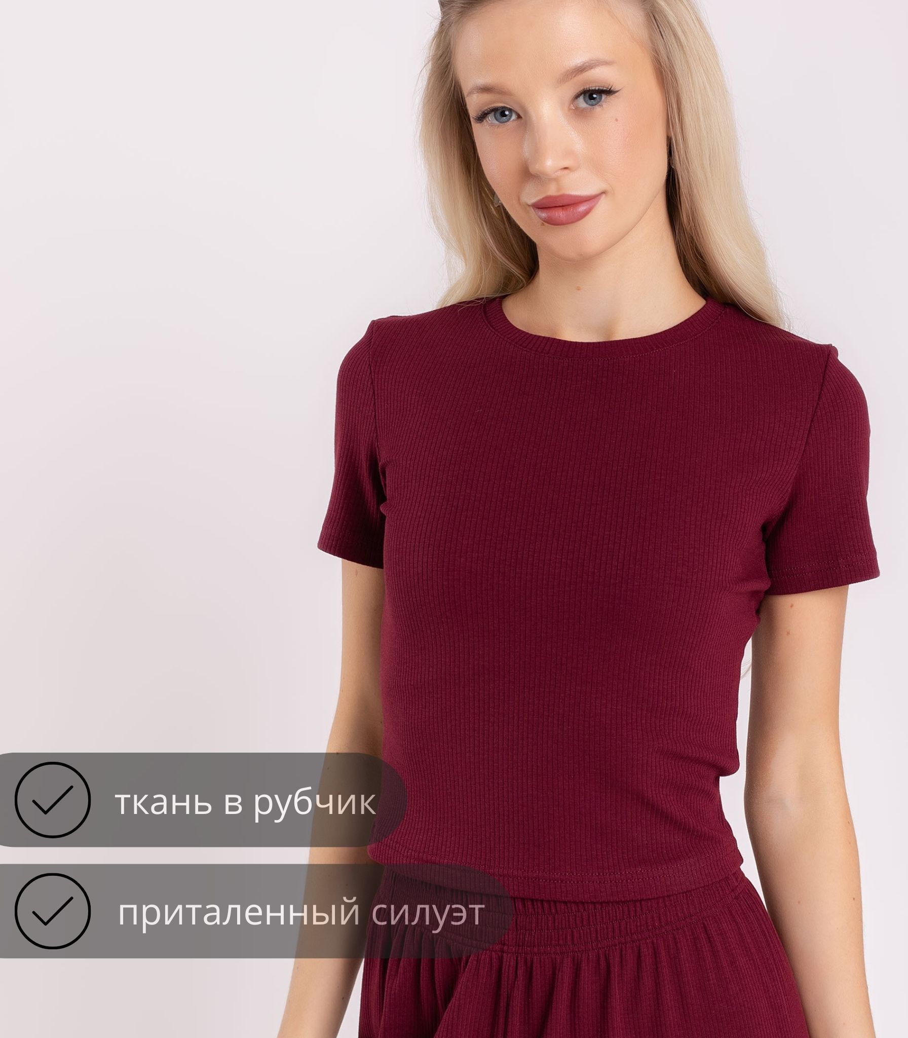 Женская укороченная фуфайка приталенного силуэта выполнена из мягкого хлопкового полотна. Модель с коротким рукавом и круглой горловиной. Базовый джемпер отлично сочетается с любым низом.;